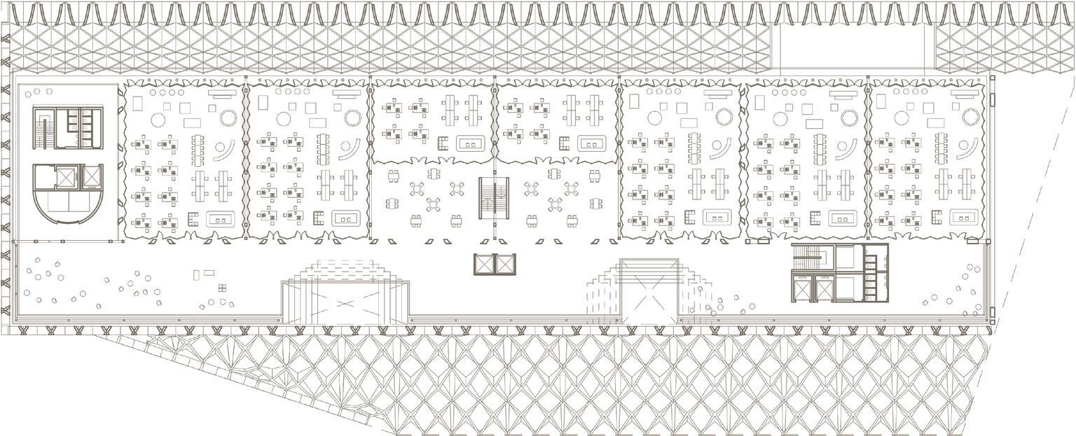 The inner envelope is a polyvalent element made of wooden louvres that connect the various openings at the central courtyard to the rooftop. On the office levels, the louvres extend inwards at an interval of every four members to perform as light shelves to the interior office space. At the roof level, the horizontal members grow closer to each other with decreasing gap in between. At the point where the members are perpendicular to the sky, vertical panels are added to the envelope to provide greater sun shading.