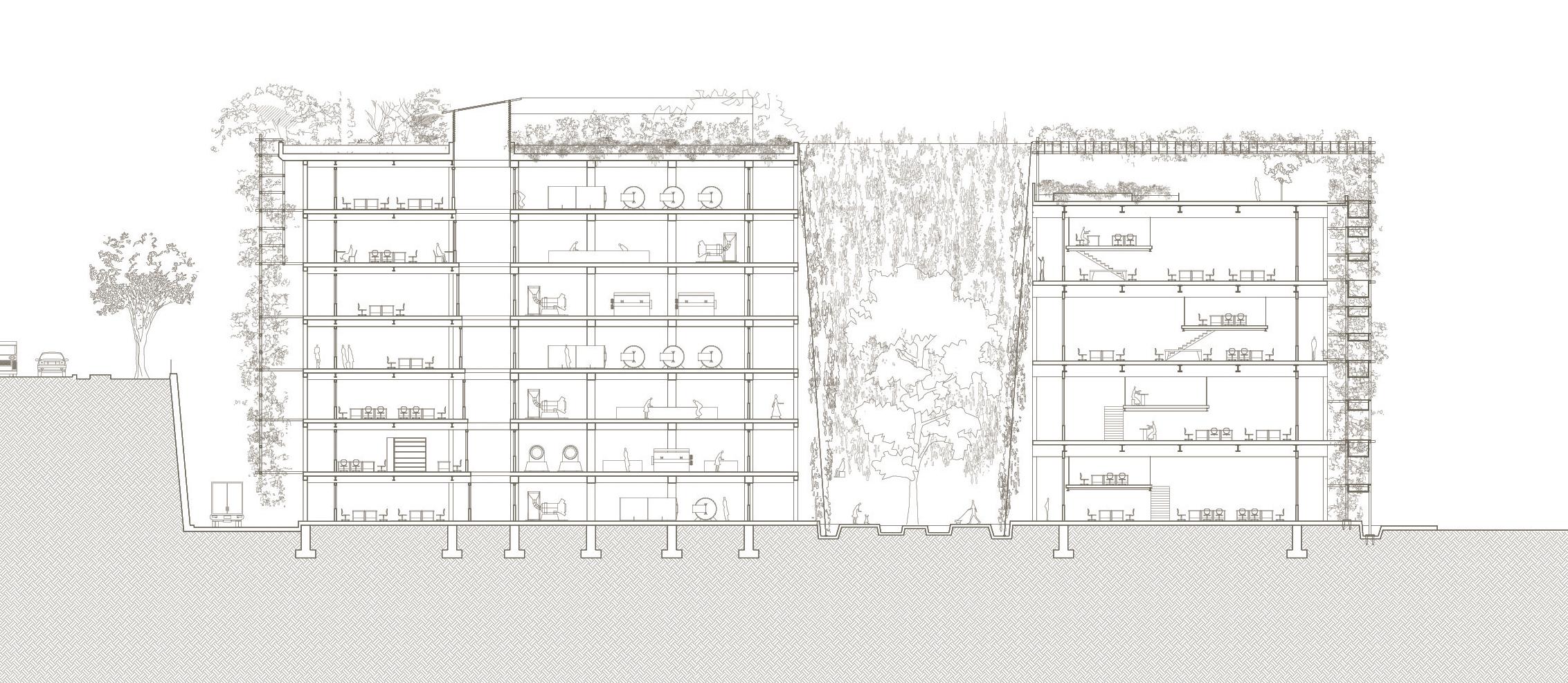 In adhering with the urban plan, the proposed design was organised to define a trapezoidal courtyard in plan, while allowing for increased floor areas above the existing building. A new additional massing hugs the perimeter of the site to the east so as to maximise the plot coverage and provide continuous street frontage. Surrounding the blocks is a series of verandahs that host a vertical landscape of vegetation, trickling down towards the green envelope of the adjacent plot (see Weathered Factory).