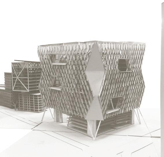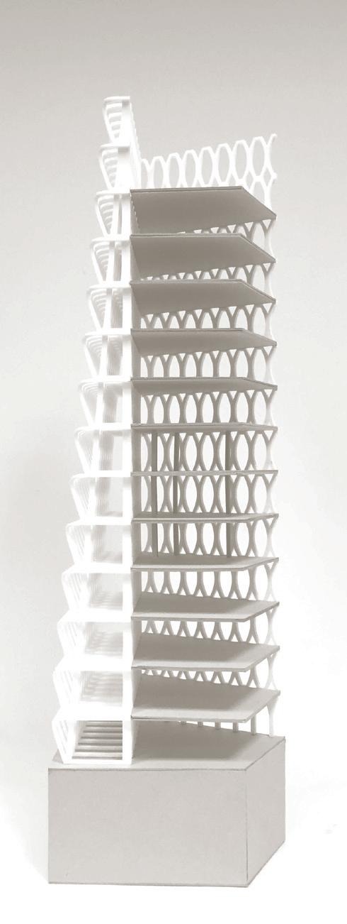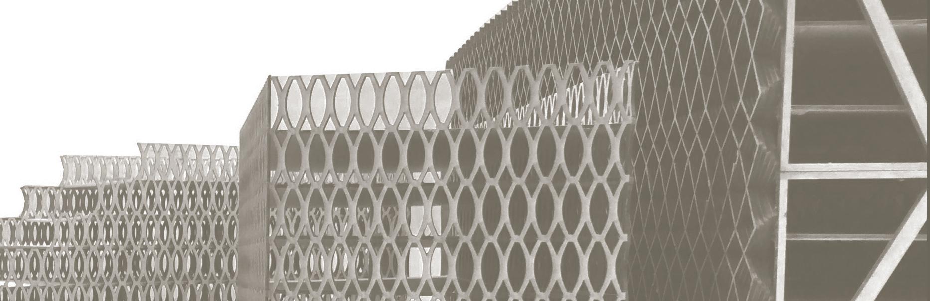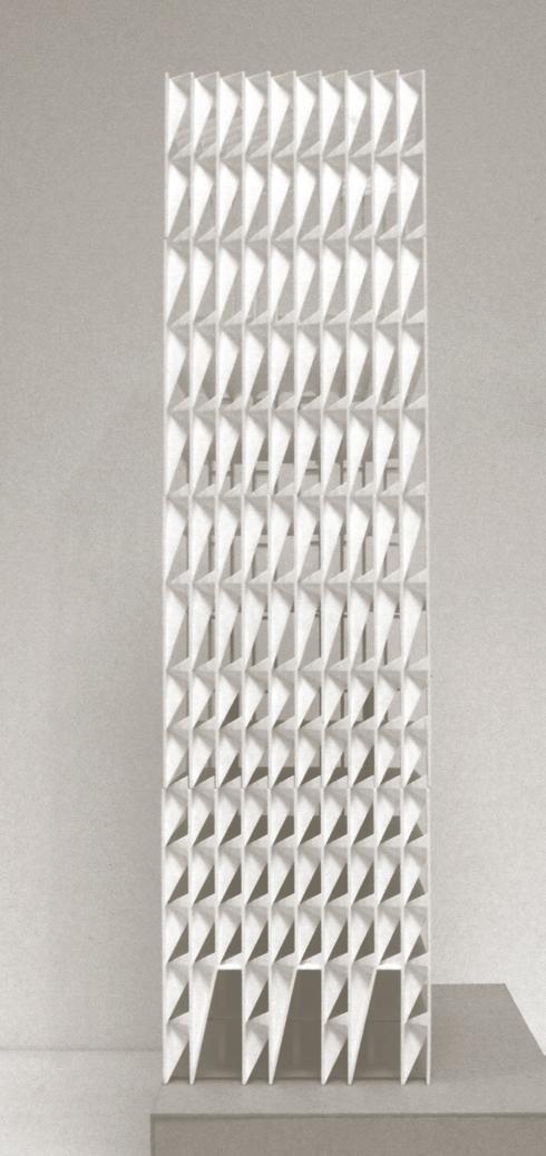 The external envelope is made of PTFE fabric with lightweight aluminium frames in the form of outward slanting diamond shapes. The envelope performs the task of shading the sun and repelling rain. Its appearance is designed to correspond with the diagrid. Concrete slabs on each floor support the aluminium frames. By adjusting the angle of slant of the frames, the opacity of the building is engineered to increase along its height. (Refer to elevation in Figure 38)