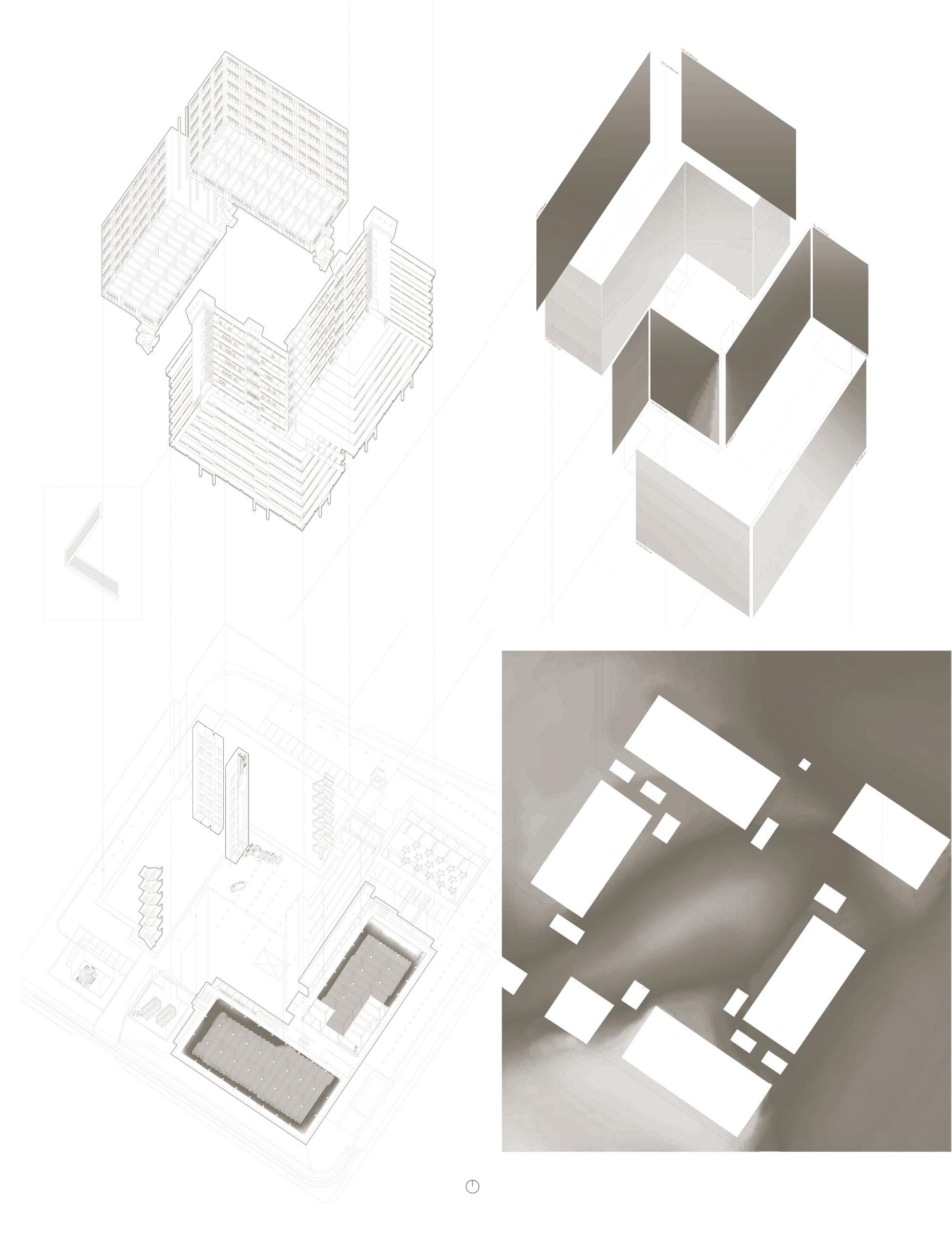 Two existing L-shaped blocks frame a natural open space with two entrances flanking the National University of Singapore (NUS) and the extended industrial development to the east of the estate. Approaching the site through an underpass from Kent Ridge station from NUS, pedestrians first enter the estate with a gentle slope towards the centre courtyard. All three proposals instinctively utilise the envelope as a structural veil to cantilever additional floor plates above the existing blocks. Doing so unifies the existing buildings and aggregates them into a larger complex. Structural demands dictate the geometry, though the simple massing and platonic form anchor the development in a large-scale building block. Specific approaches to the envelopes seek to mitigate sun load and noise transmission from the adjacent expressway, as well as minimize air-conditioned energy usage.