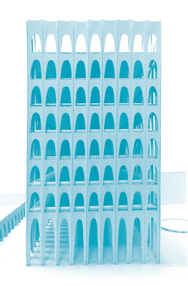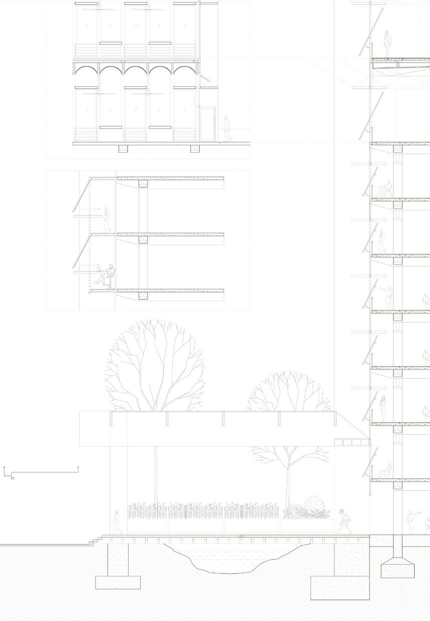 Glue-laminated timber (GLT) columns and Cross-laminated timber (CLT) panels are employed as relatively lightweight materials that span above the existing reinforced-concrete structure. Referencing two precedent case studies, the structure-climate dialogue is manifested as exteriorized structural mass. The two cantilevering corners of the building are supported by GLT arched beams, which are recessed into the building.