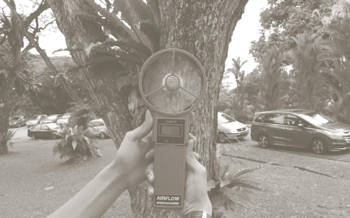 2. Ayer Rajah Industrial Estate was studied for climatic and environmental attributes including shadows, solar insolation, wind, acoustics, traffic, rain, drainage and programme. The outcomes were manifested in a series of drawing and simulations to illustrate and make visible sun exposure, wind conditions, rain intrusion, and sound. These digital simulations were compared to on site measurements with analogue apparatuses such as hand-held wind meter and sound-level meter (Figure 3). The analogue data is deployed to confirm or refute the data produced through digital simulation. Often, the analogue information proved more accurate and in line with site observations.