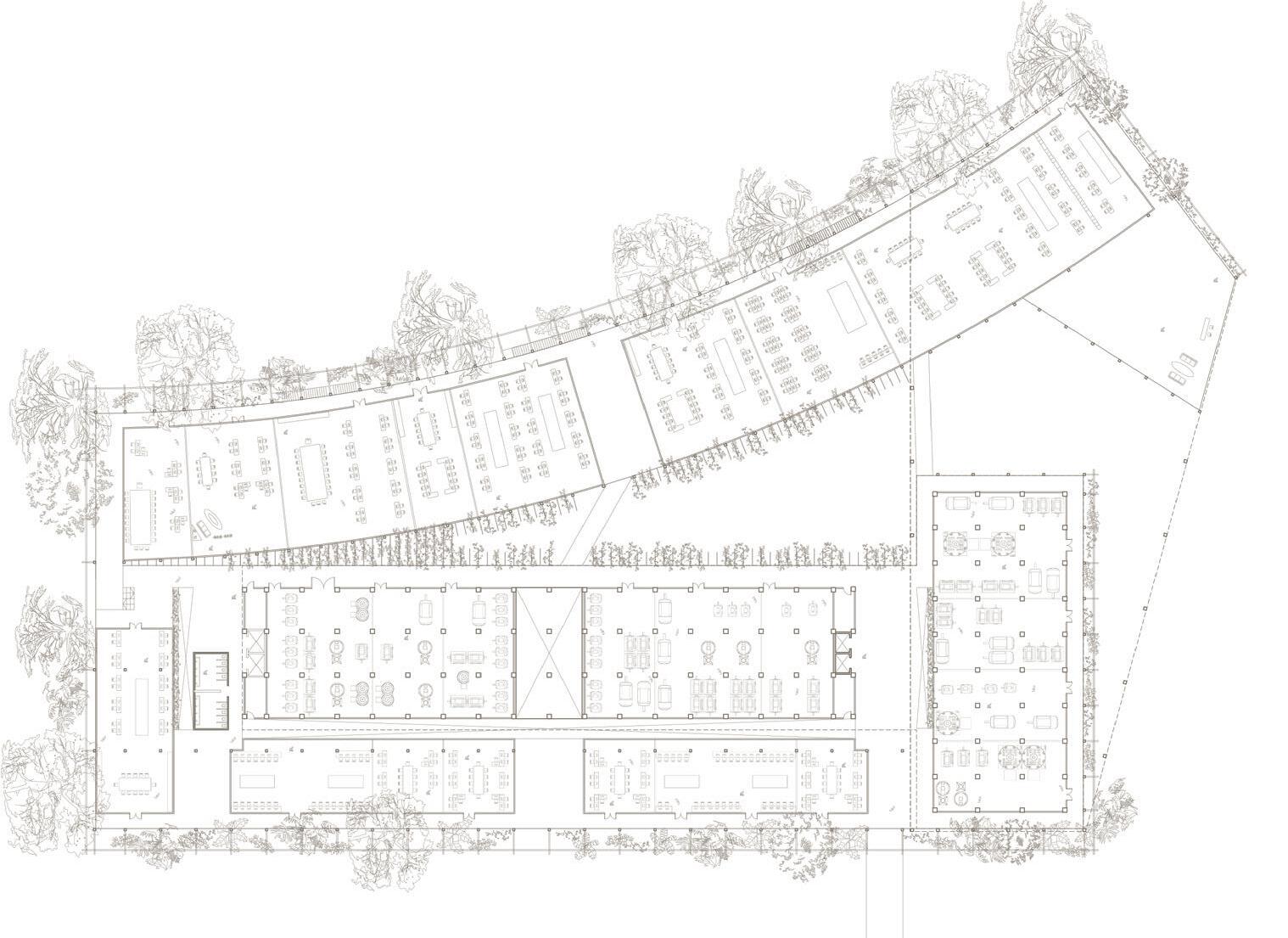 This breathing envelope flourishes in the wet season, blooms when it tapers off and withers in the dry season. The variation in weather conditions controls the atmospheric transformations within the building. In the wet season, the lush green thickens around the building. In transition, as the initial shortage of water kicks in, the flowers bloom in an array of pink and white. In the dry season, the branches grow bare and camouflage with the Corten-steel grid, turning into variant hues of brown and gold. The vegetation significantly thins, but the spatial thickness remains as a sufficient buffer between the building and the elements.