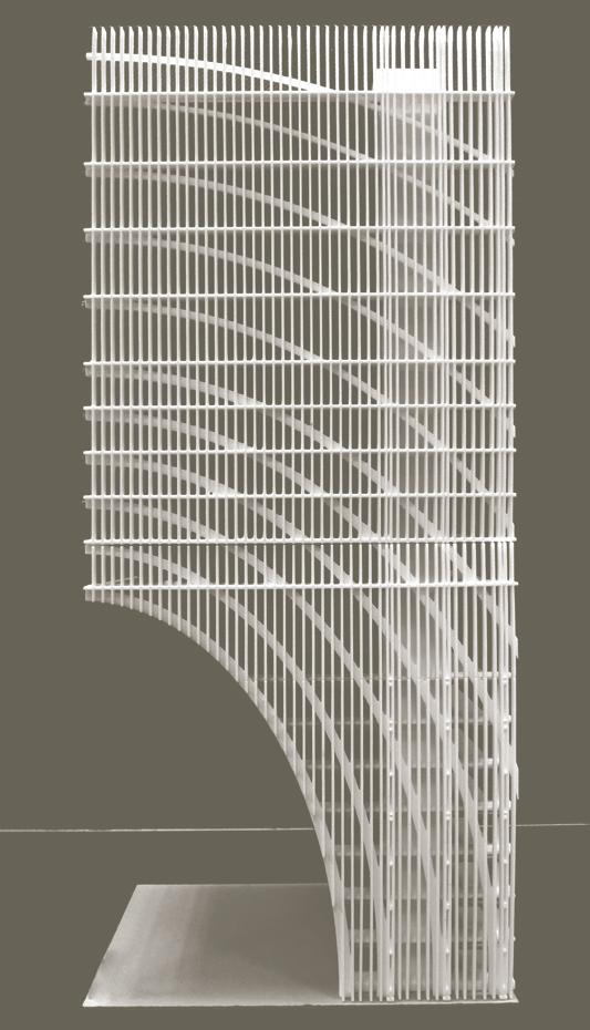 The formulation of the structural module, elliptical in elevation and spanning floor to floor, is based on research into the internal day lighting of the floor plate, thermal load reduction, acoustic dampening, and structural efficiency. Thus, a ratio of thirds was used in determining the curvature of the concrete profile, taking into consideration that the top one-third will facilitate indirect day lighting as a light shelf, the middle third provides appropriate views to the exterior and the bottom third operates as an efficient transfer of structural loads.