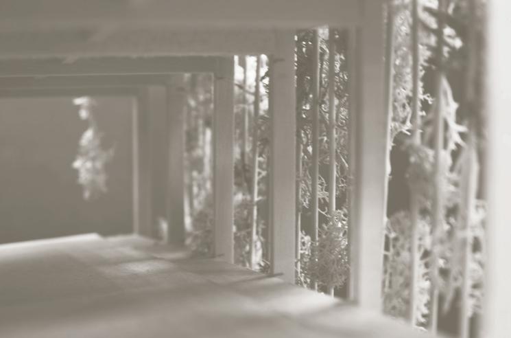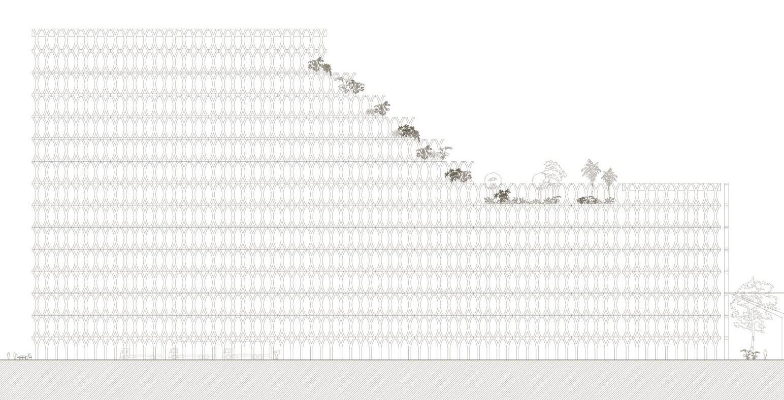 The climatically harsher East and West elevations are furnished with a dense cluster of vegetation (Figure 70). These plants have larger leaves in order to mitigate a higher thermal load and filter out stronger sunlight. Vertical strips of staircases sheltered by planter boxes are designed to sporadically interrupt this grid. These vertical elements provide visual porosity.