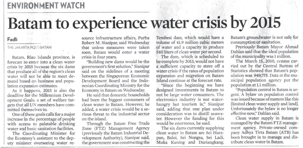 Yet, even as Batam is facing its own water crisis, it was reported in the very same year that plans were underway for Batam to supply water to Singapore, who was also scouting for new sources of water.