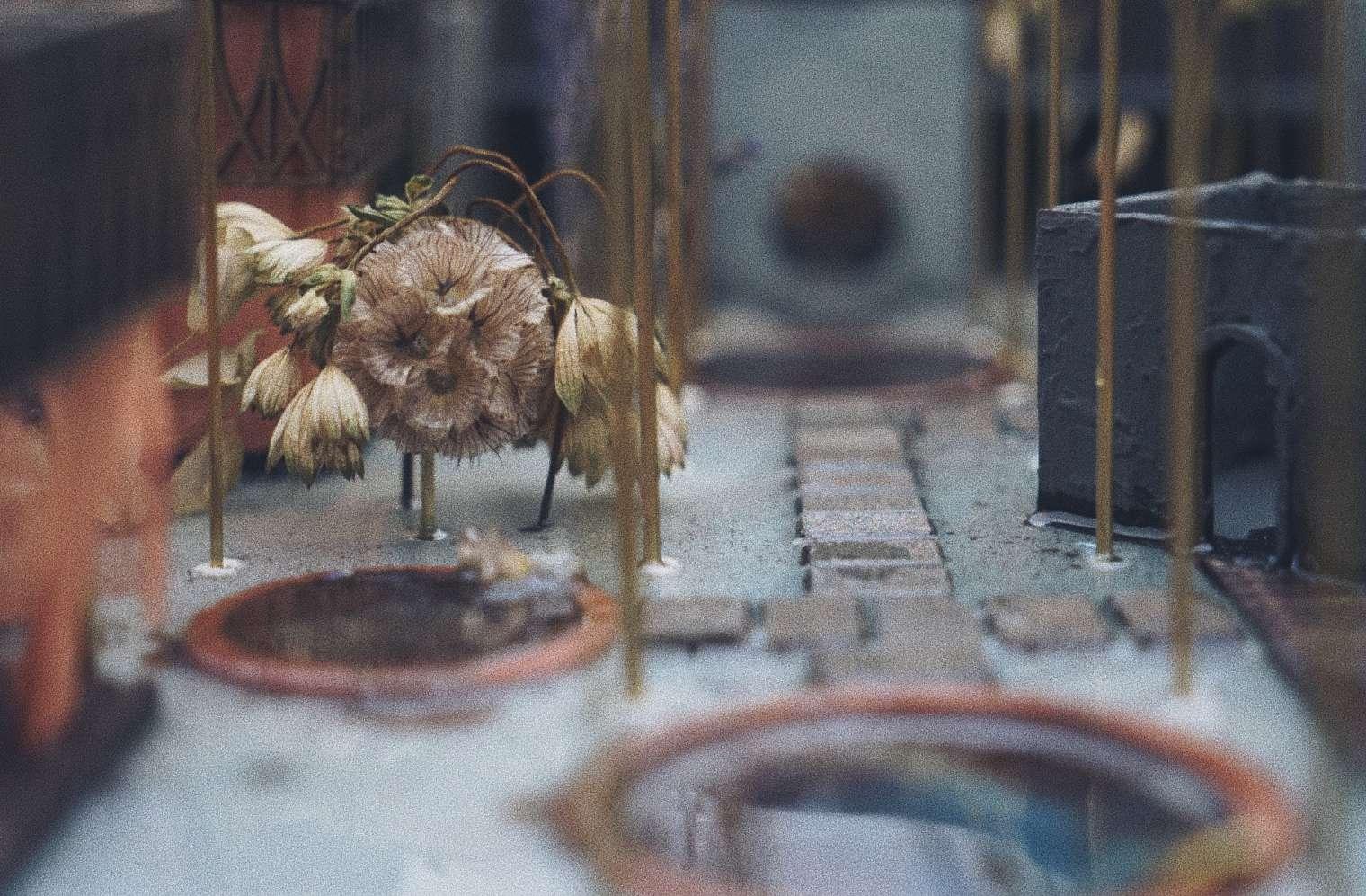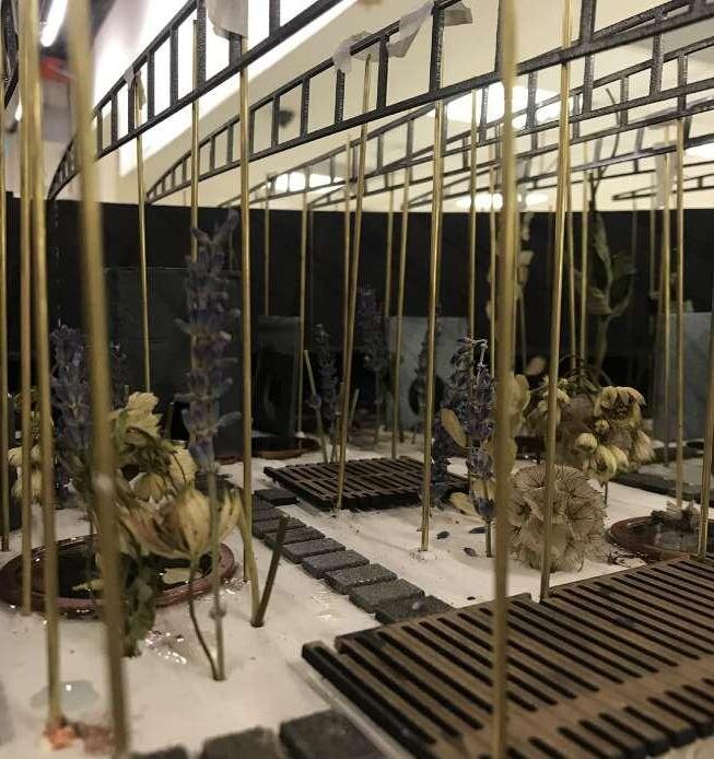 Peak through the rusticated copper curtain mesh and breathe in lingering metallic smell that fills the air.