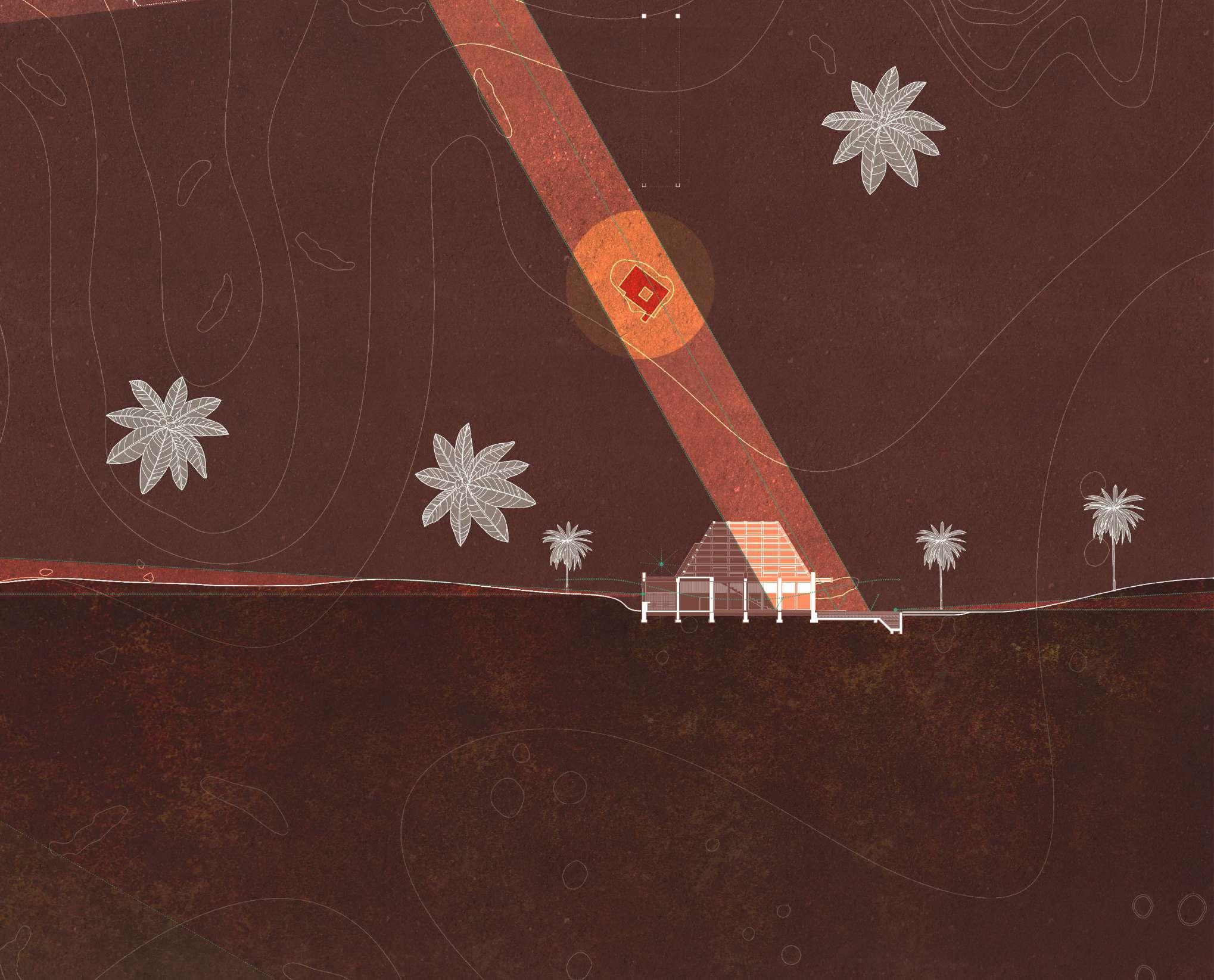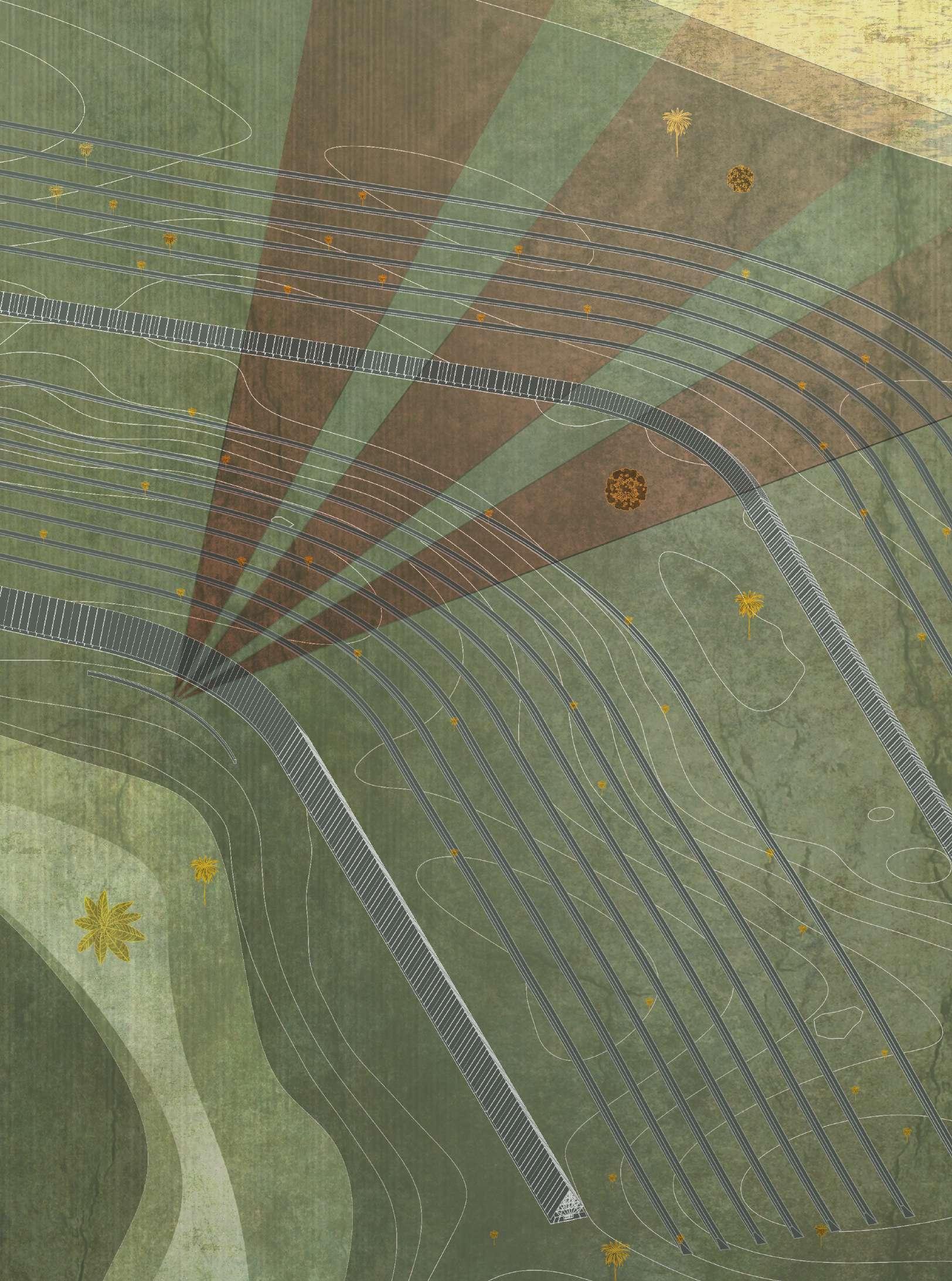 The long scroll Revealing the journey across a section cutThis drawings presents the journey in 10 unique but consequential architecture and landscape events across the site.