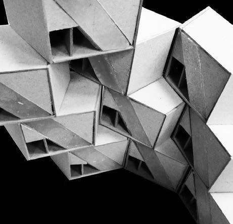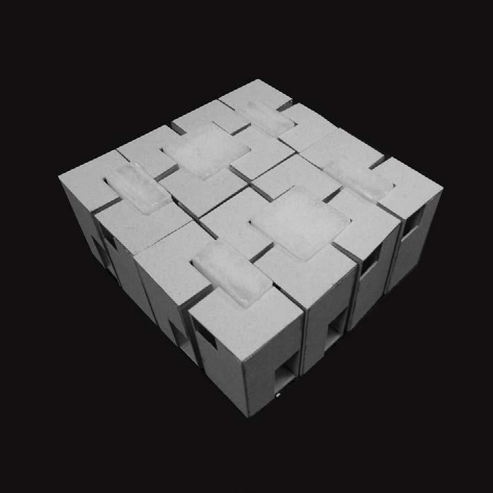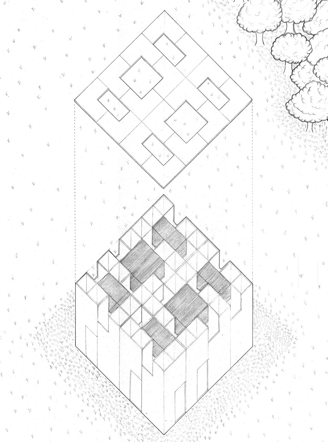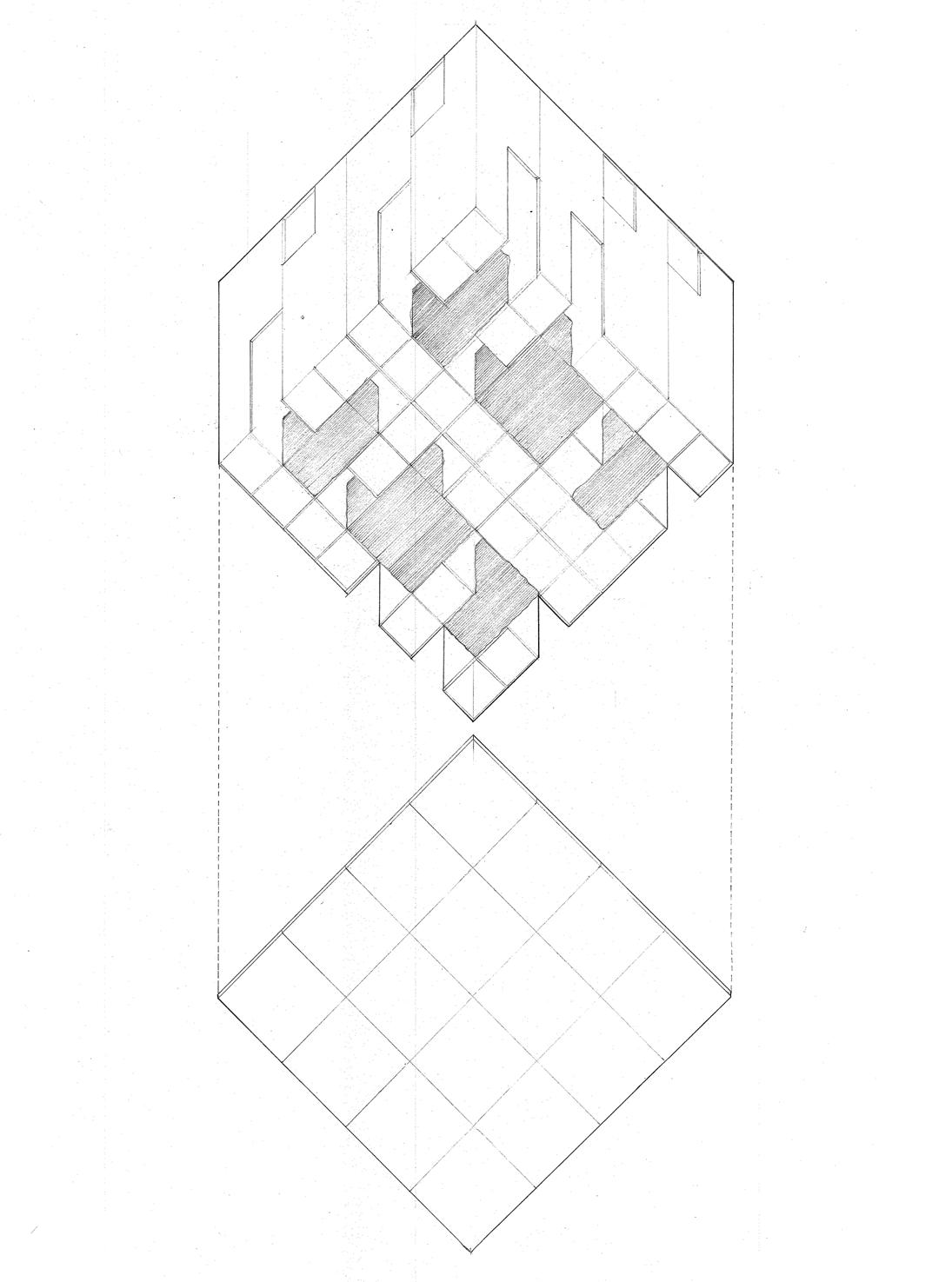 The latest configuration is a result of single modules tesselated by shearing on two sides on the x-y plane, save for 4 units displaced vertically to denote spatial hierarchy as well as to puncture the aggregation to create openings and porosity.