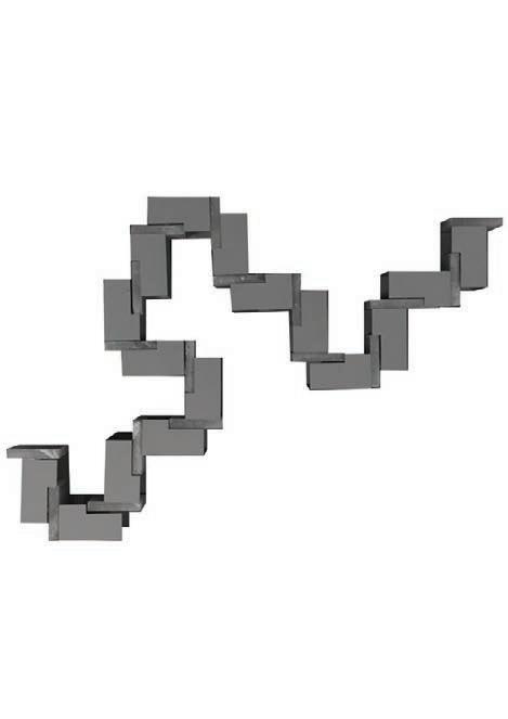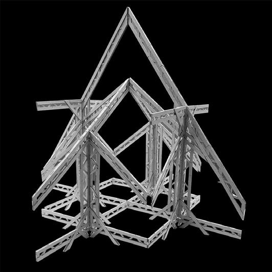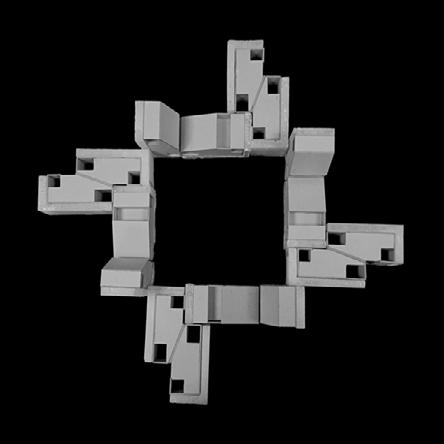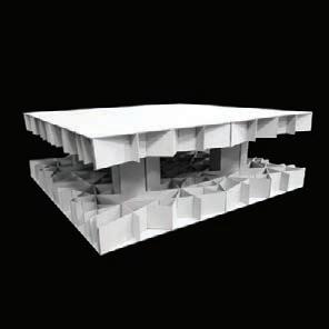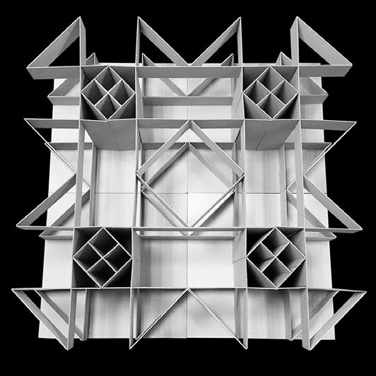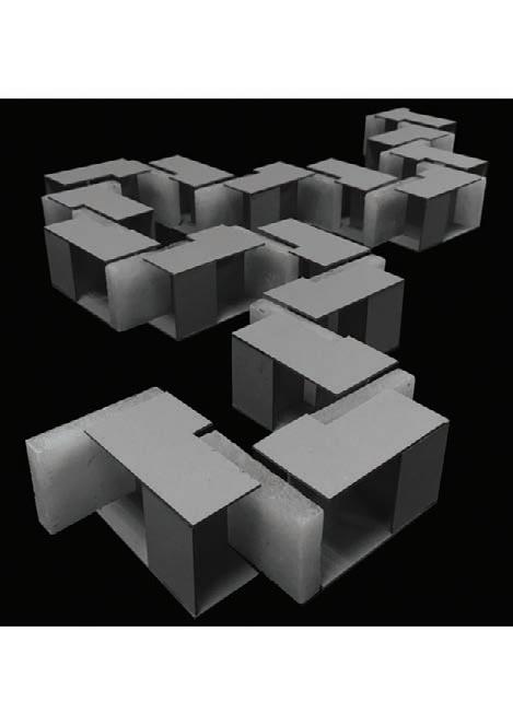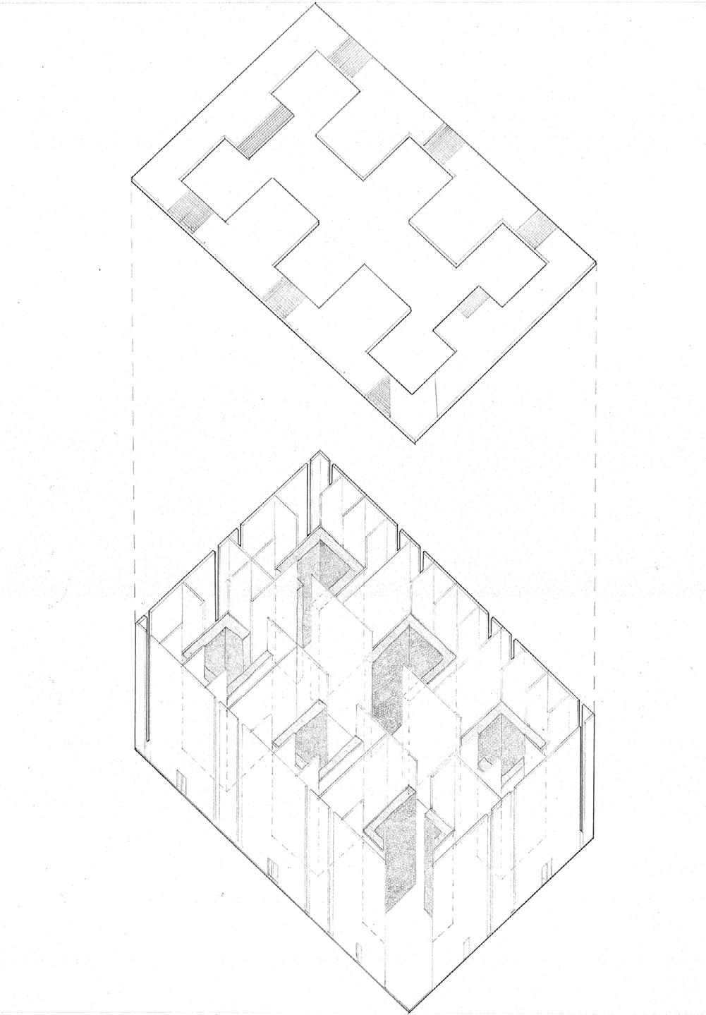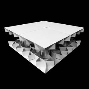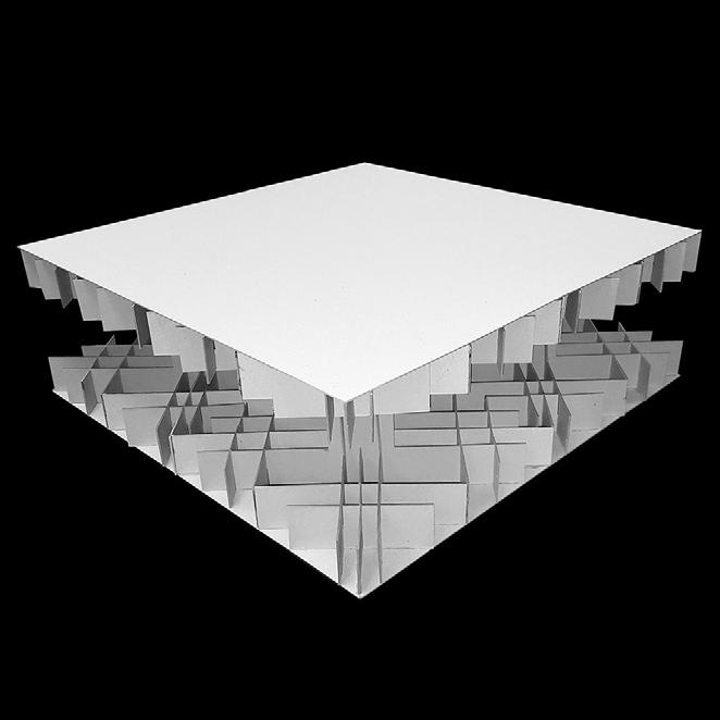 The latest configuration is a result of single modules tesselated by shearing on two sides on the x-y plane, save for 4 units displaced vertically to denote spatial hierarchy as well as to puncture the aggregation to create openings and porosity.