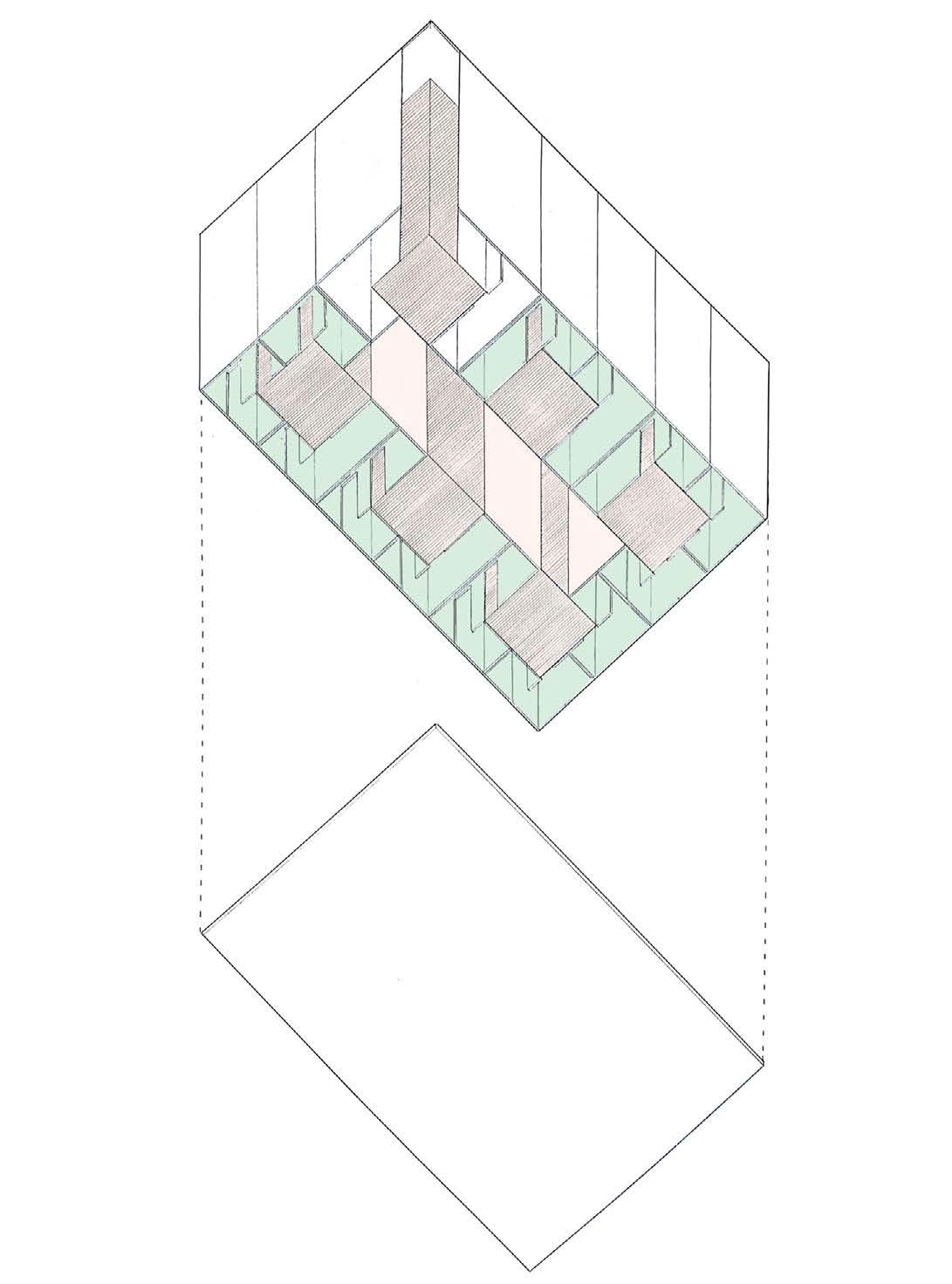 Every unit is autonomous with sleeping and cleaning areas for a single person and constructed out of CLT. 4 second-level units and an isolated single unit act as communal and caretaker lounges respectively. Internal spaces are denoted by planes, but never an entirely encosed volume. Units tesselate in pairs and threes with every 5 units sharing an L-shaped courtyard and an elevated lounge accessed by 2 concrete stairwells which also double as water collection and storage.
