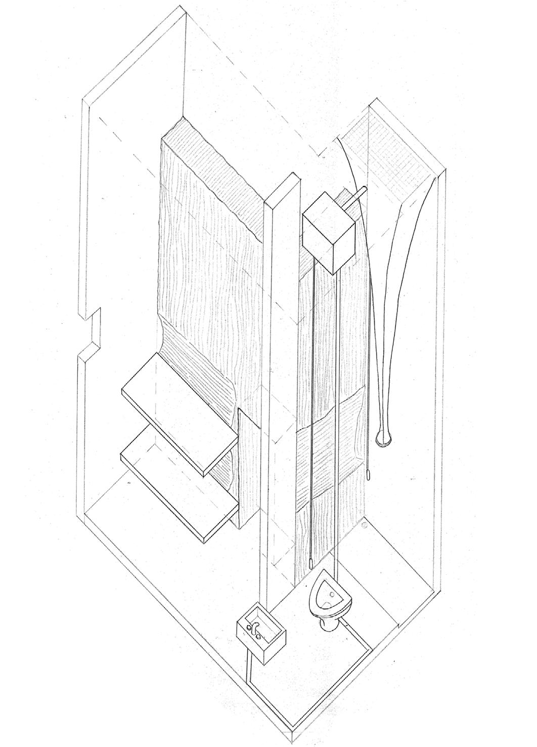 In terms of program, I focused on the bare necessities of resting, cleaning and eating. For resting I cantilevered two pre-cast concrete panels out of the cast-in-situ concrete with a nook carved out for them to either roll into or place their things. The top panel is only 1.2m off the ground so it does not require a ladder to climb on top. For cleaning, I created a hole in the roof to collect rainwater and a concrete stalactite structure descends from the roof and tapers to a shower head. This well on the roof also helps to flush the old-fashioned toilet adjacent to the shower. For eating, I’ve mimicked the language of the main structure in concrete benches placed 3m away on the south side. This allows for a close proximity for eating while creating a need to venture outwards to the outdoors out of the solitude of the structure.