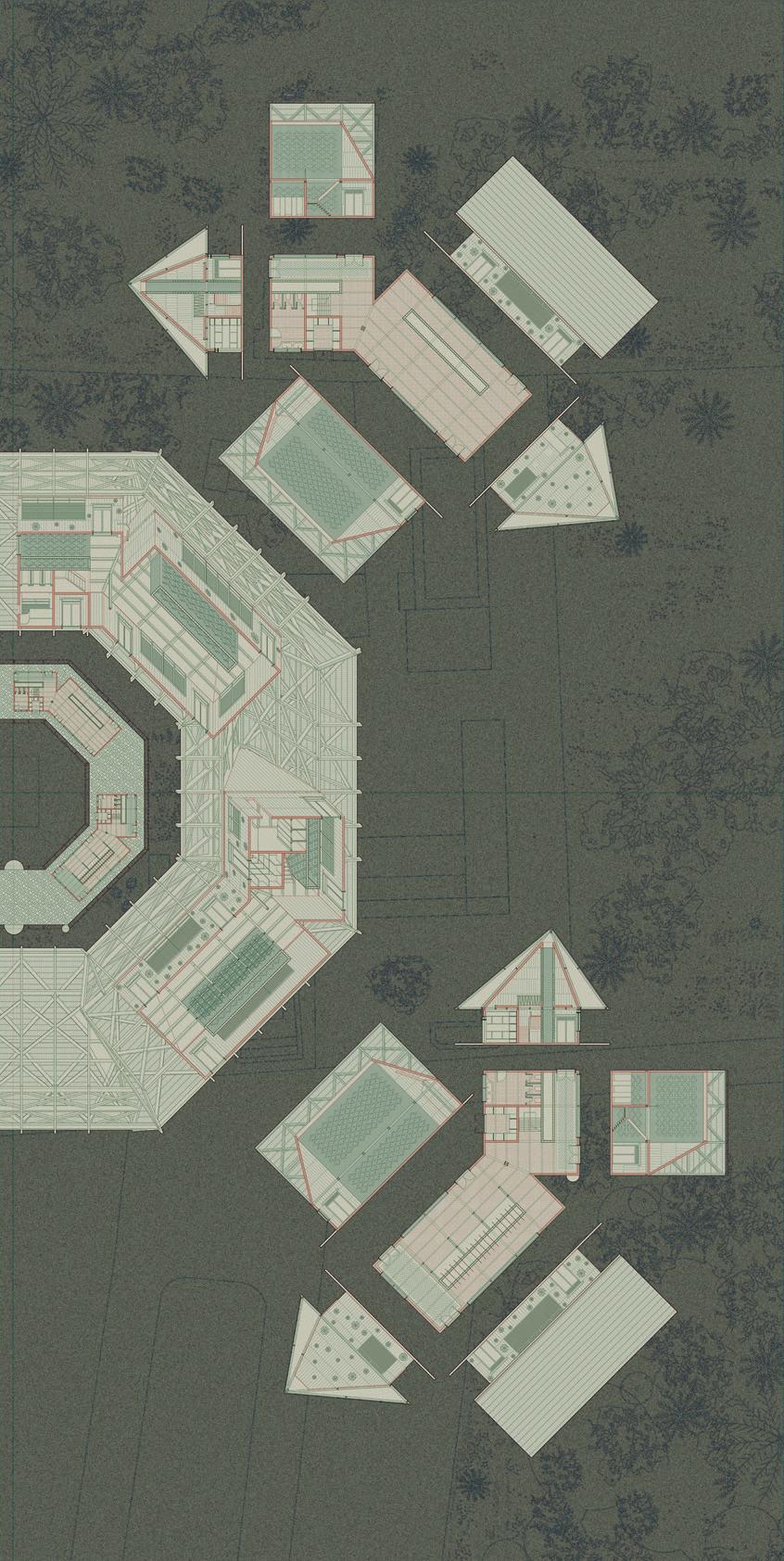 As its neigbour, there is the Chinese Embassy and the replica of the Ramawa statue (another curious gift from the Chinese). The architectural proposition is a Trojan Horse of horse of sorts: A gift from the Sri Lankan government back to the Chinese. A building that houses Sri Lankan craft, urban vernacular building processes and Chinese building technology. The building is a referential figure of the monument that it sits across to, in a fragmented format. The massing hug around a center that is the Sinhala Association. Curiously, it also takes on the plan which protects the navel as a kind of centre, a figure heavily eferenced in South Asia for a long time. A gentle counterpoint to the monumentality of the conference hall.