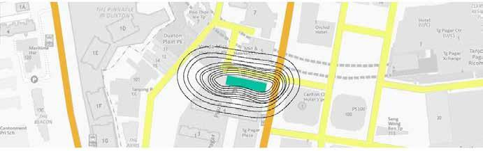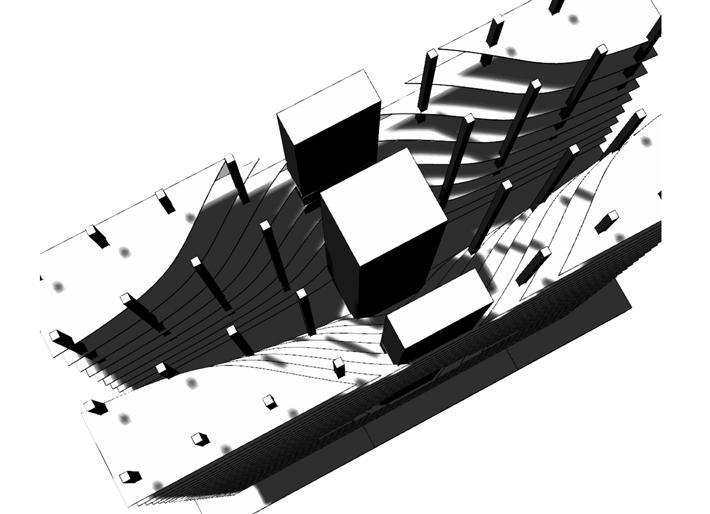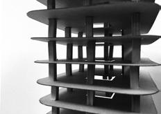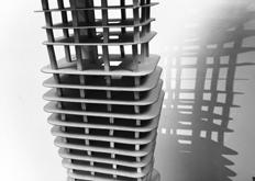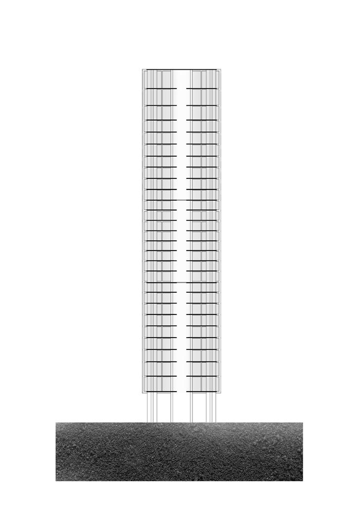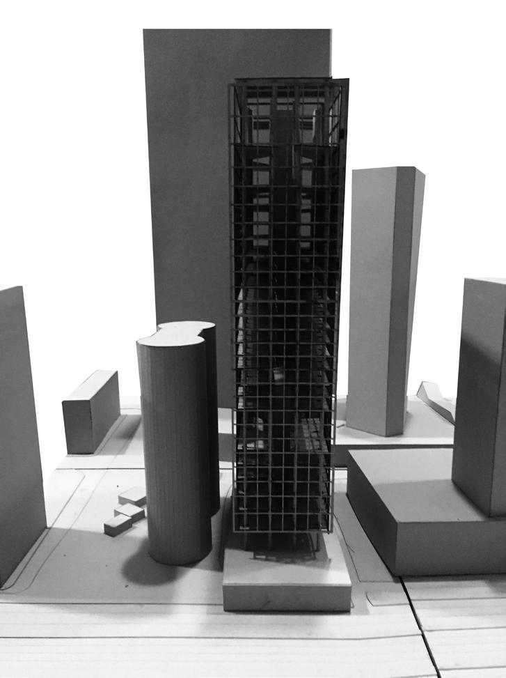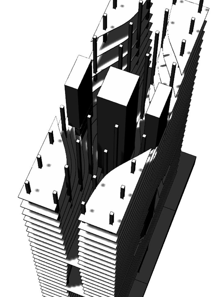 It proposes a tower floor plate that graudally peels away from its core and in that process creating a central atrium that is open to its north and south facade to allow for maximum penetration of day light. Floor to floor heights graudally decrease with the rise of levels in order to reduce the impact on heat gains from the sun on the floor plates of the tropical tower. Its windows decrease in opening size, forcing its occupants to look inwardly towards the central atrium instead of the peripheral external view. Architecturally, the intent is to create a vertical experience within tower instead of a conventional horizontal stacking of floor plates.