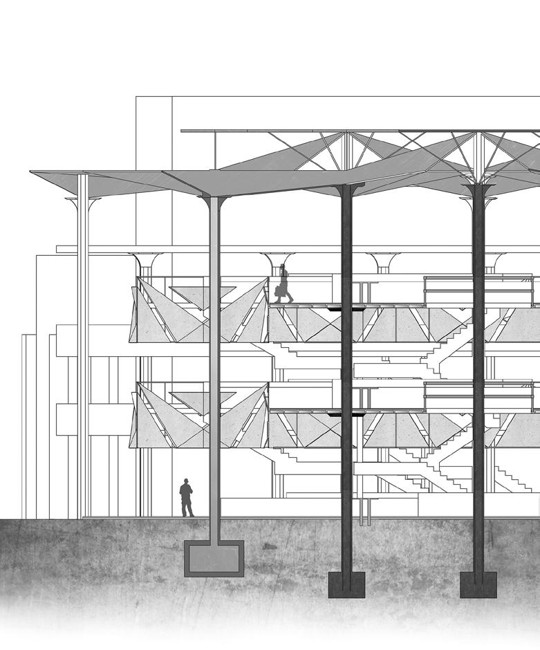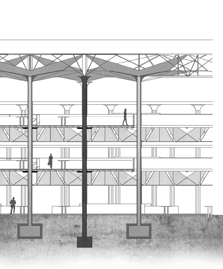 The structure of the building is made of reinforced concrete with post tension steel bar with a gutter in the middle to drain off the water efficiently. The diameter of the roof span varies from 15m-6m and the height of the umbrella varies from 13m- 6m. Tropical plants such as nassella tenuissima will be grown on top of the roof to act as another filter for the atmosphere and reduce the heat island effect of the building.