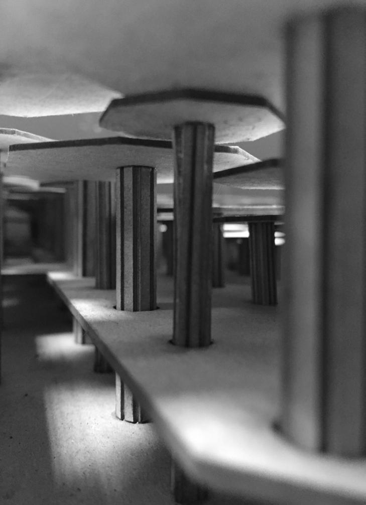 Based on the program of the wet market, a double volume structure with a large open floor plan is created in order to allow venders to utilize the space more freely and to allow efficient cross ventilations for the smell from the wet market to dissipate quickly. The span of each umbrella is 15m with greater overlapping of minimum 1m and allows larger aperture size of maximum 1m between different roof layers to maximize light penetration and odour to escape efficiently. For the dry market, in response to the design requirement to doubling the area, the building is designed to be 3 storeys height. The height and diameters of the module decreases as it approaches to the centre. This creates more apertures in the centre and allows more light to penetrate to the interior and provide sufficient lighting even at the centre of the market. In this design, the umbrella roof does not reach full coverage of the market. Some gaps are deliberately left in between layers to allow rain and sunlight penetrates to the interior. The intention is not only to enrich the atmospheric quality and makes architecture more permeable but also to use them as a boundary and a void to decongest the chaotic market space which heavily occupied by mercantile functions under a large homogeneous roof.