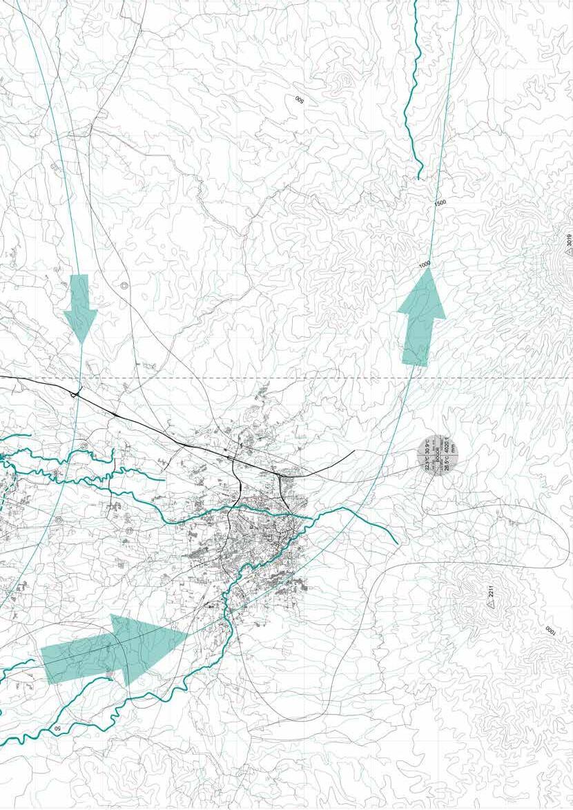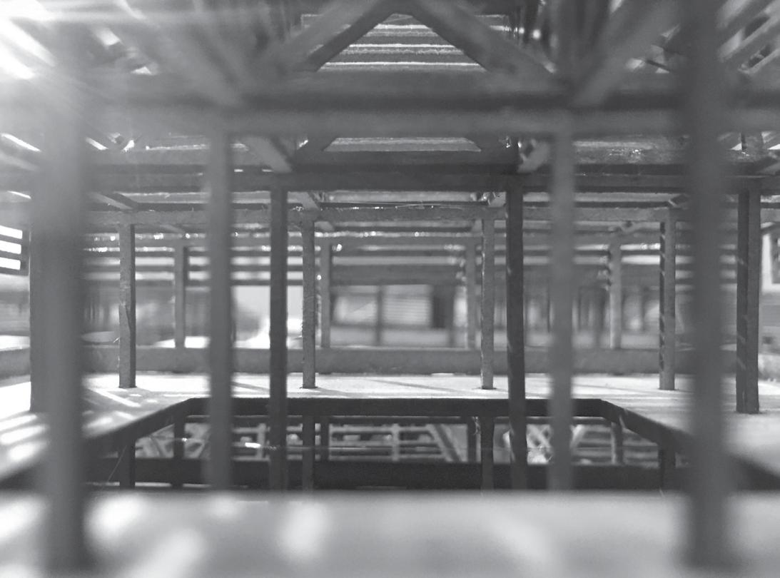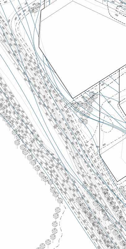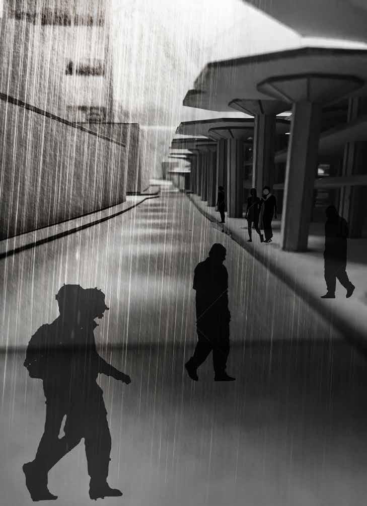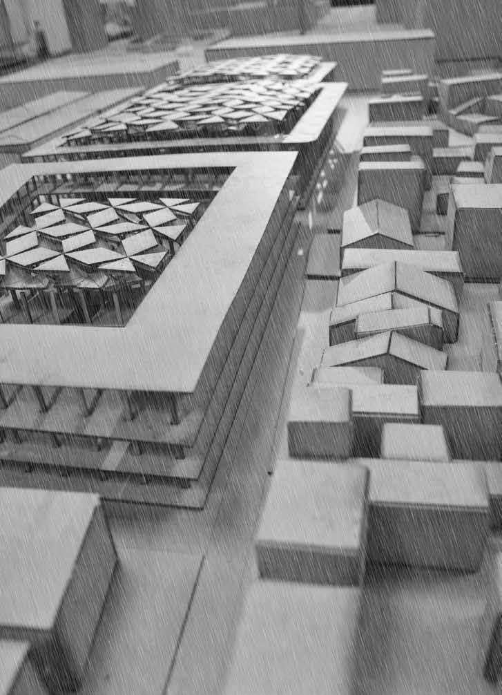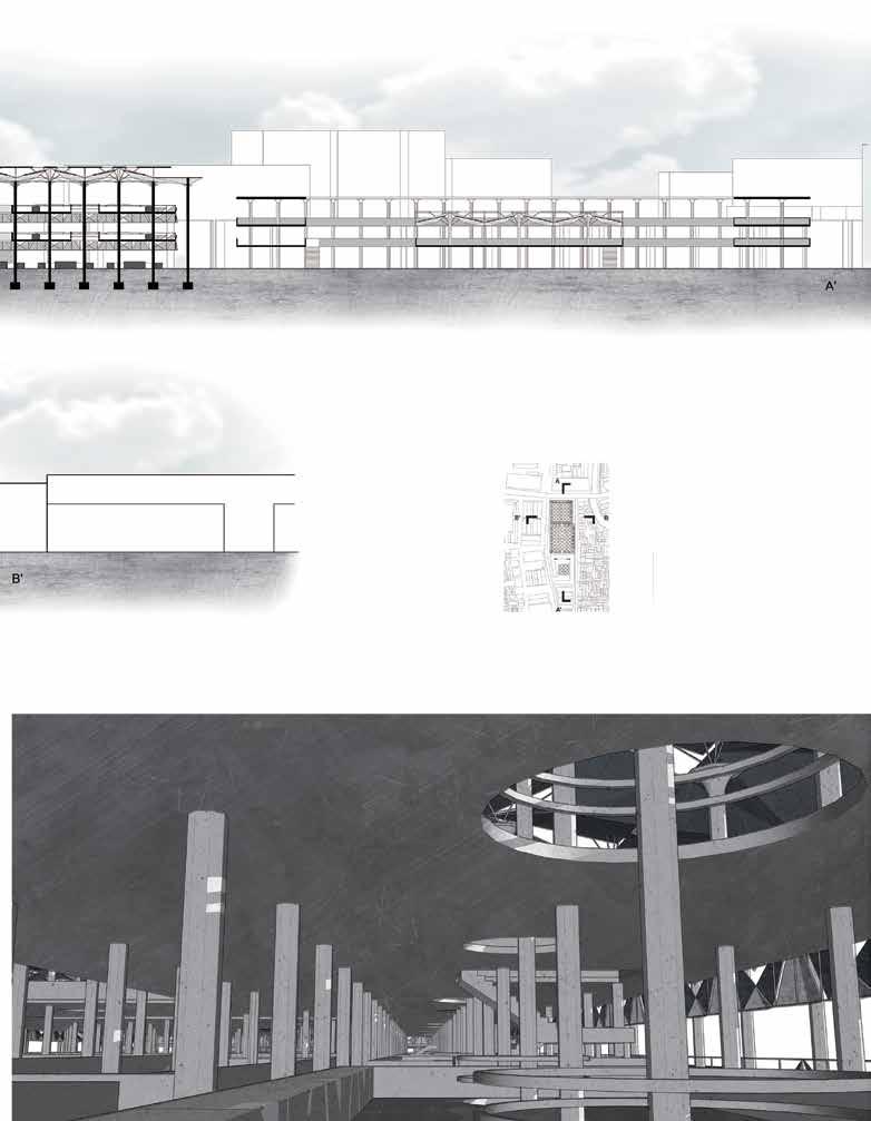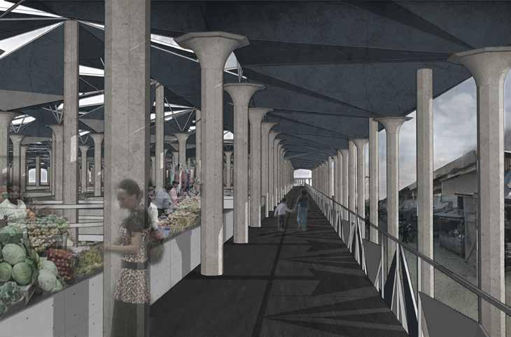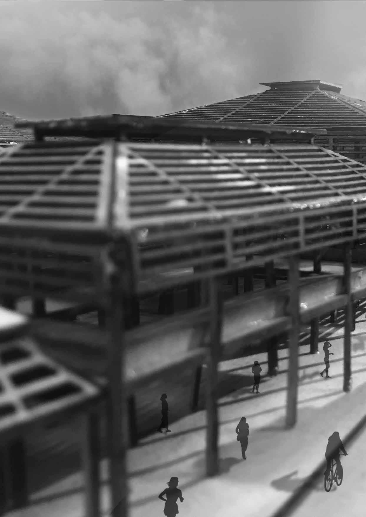 As a coastal city, Semarang is rather threatened by natural events than it takes advantage of them. Annual floods are common, and water bodies lay polluted as urbanization spreads. It becomes only necessary to return meaning to the river and take advantage of the water, avoiding diseases and economic loss. The project, though not in danger of flooding terrain, proposes to re-open trade through the river, and becomes more permeable to it’s side, where it fronts the street with a day and night market. Divided into 3 volumes, big roofs span between columns, where volumes remain unattached from the structure, allowing cross ventilation to occur. To address light and to protect inner spaces from heavy rain, the big roof breaks into layers, that are superimposed and change form and size due to structure and program. Here, “v”-roof layers allow water to be collected and redirect it to the ground.