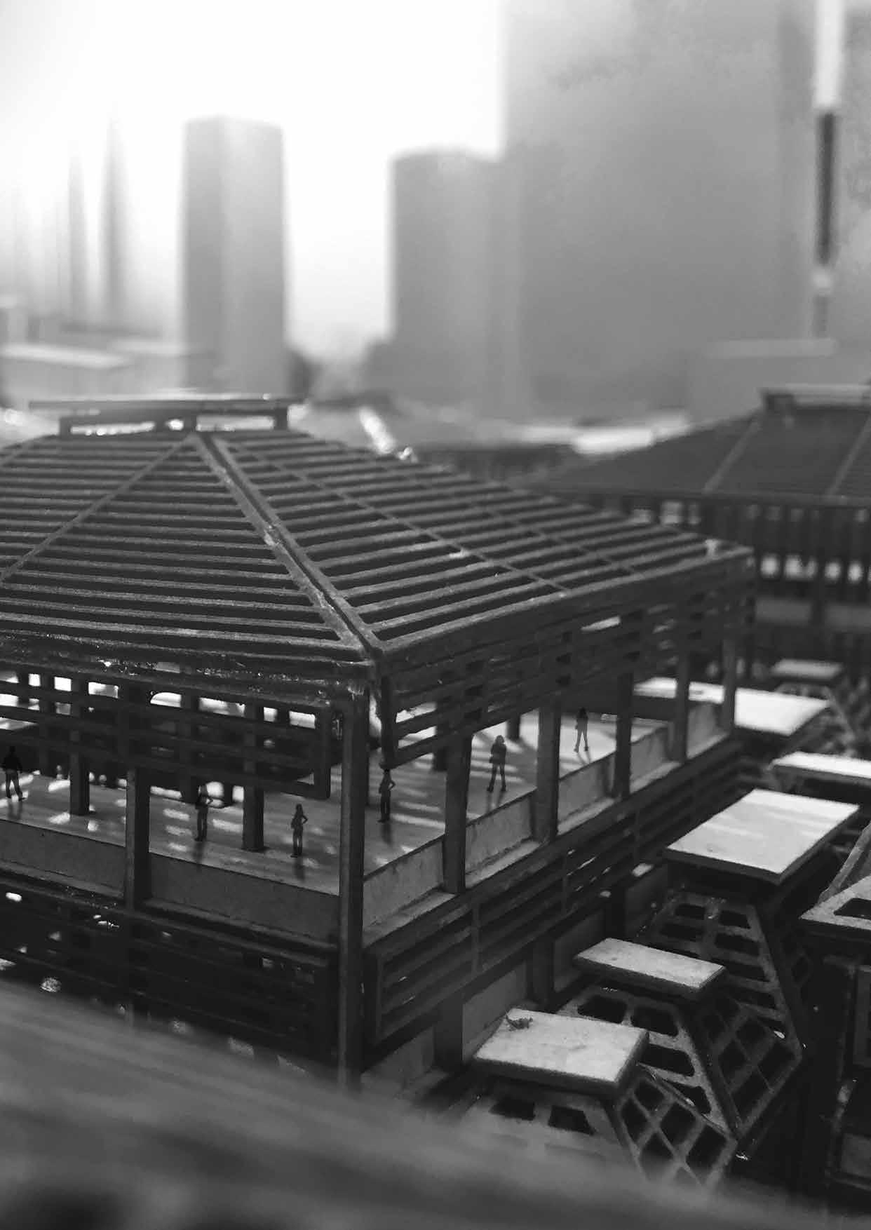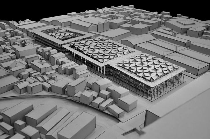 That is the reason why I want to keep some original structure elements and column grid, also continue the particular form of traditional market. Instead of doing a gigantic roof, the new roof is composed by a number of nine columns units. The two overlapping layers and the diversion detail of water help the market gain daylight from sky and natural ventilation, and also drain away rain to the columns, when four units combine together.