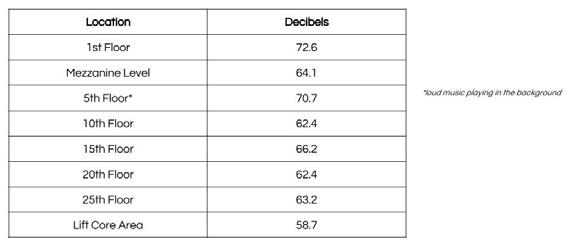 The table on the left is the data I have collected by going to selective floors of the building. The results clearly indicates that the higher you go, the lower the noise level. From the experiment, I also discovered that the average readings on the ground floor stays rather constant throughout in most areas. Which is safe to say that the condition of Jakarta would be similar. and therfore, I project that the average acoustic readings of jakarta on the street level is about 75 dB.