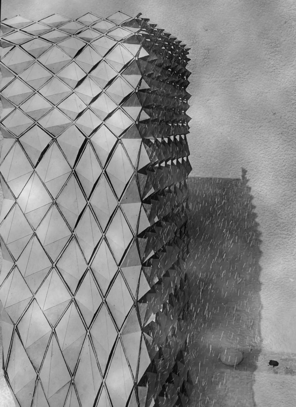 Fins are attached to the diagrid in response to simulations done which reflect the incidence of wind and to reduce the exposure to sun and rain