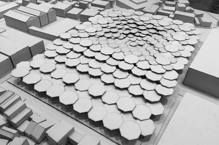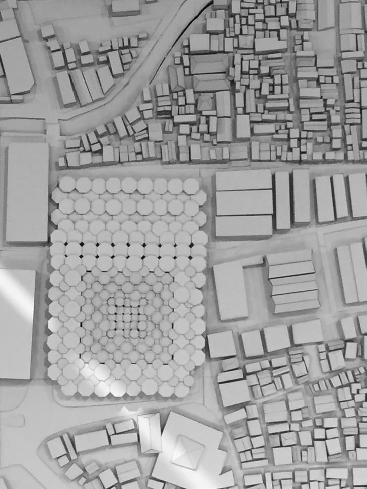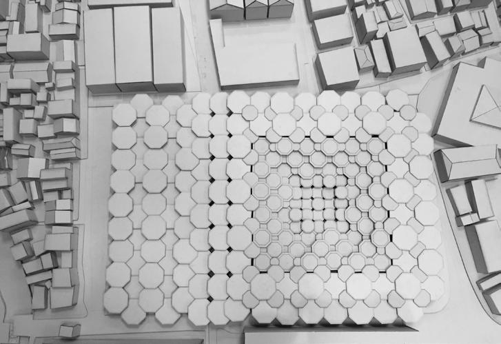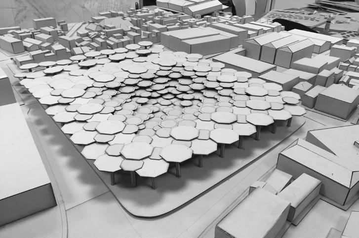 The market consists of two parts, the wet market and the dry market. The site is built upon 2/3 of the burnt down Pasar Johar and the dry good market right beside it due to its damage and poor condition after the fire. The other 1/3 of the Pasar Johar will be re-occupied by the industrial and commercial buildings. The design uses the octagonal umbrella as a module. The reason for choosing octagon shape is because it has a direct symbolic meaning to Carsten’s scheme, and possessed the inherited memorial value for the local people. By varying the heights and diameters of the modules, different layering and patterns of overlapping are created in responsive to the market space and function.