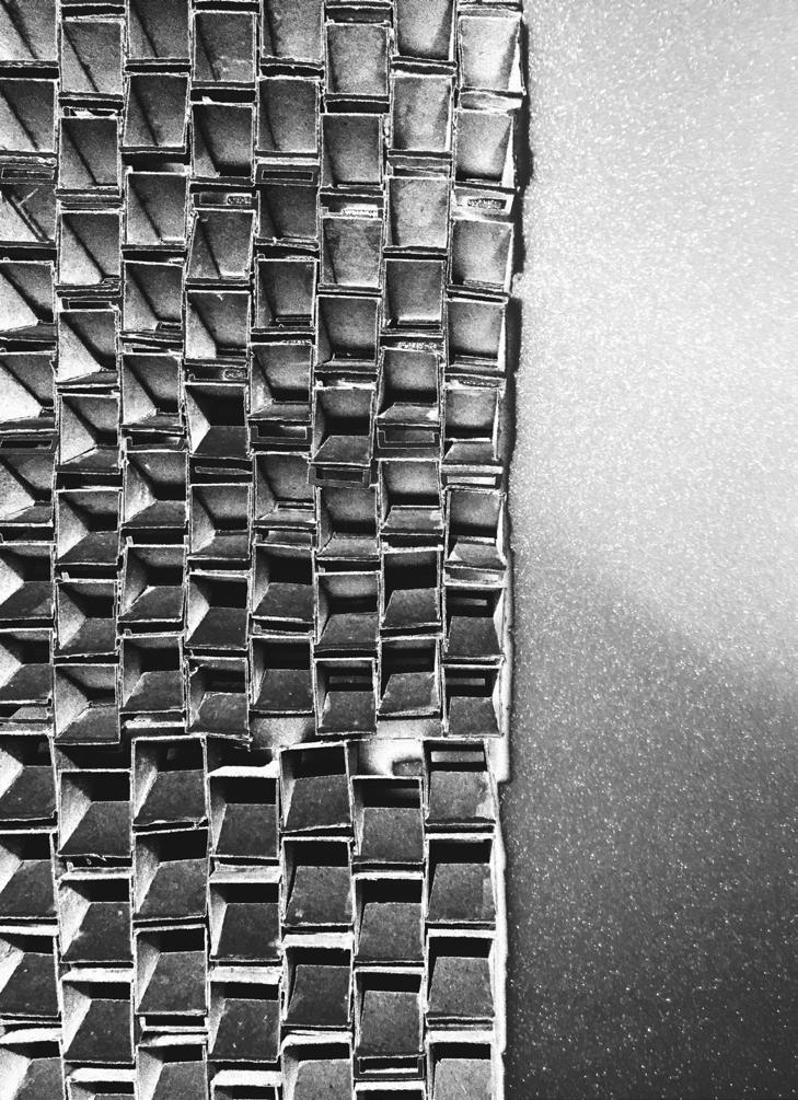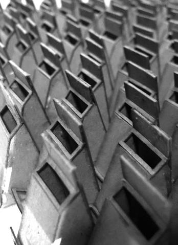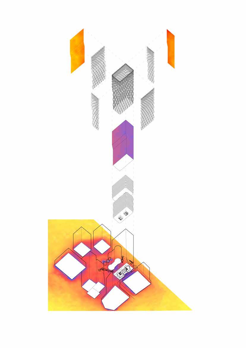 It has been tested from the earlier experiment, the higher you travel up the building , the lower the noise level. Therefore, we will be able to see a transition of modules that goes from bigger depths to a smaller ones, And the overall sizing of each modules will change accordingly based on the optimization of angles and depth. What I hope to achieve within the interior spaces of the tower is a constant acoustic intensity with the varying sound damper that I employed on the facade.