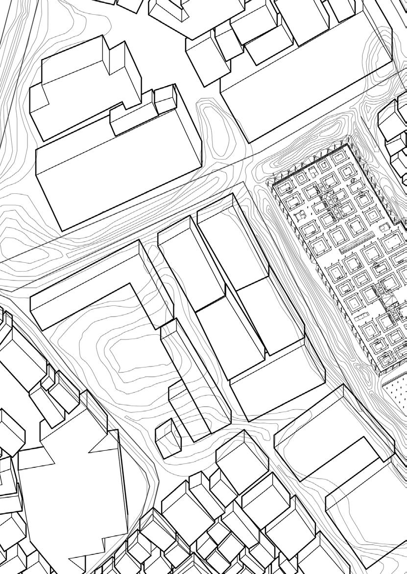My design is a rejection of Thomas Karsten’s monolithic big roof design. Urbanistically, the big roof design does not fit into the fine grain urban structure of Semarang. Hence, my design approach centers around a series of aggregated roofs. The arrangement of the aggregated roofs in my design took cues from the intelligence of the existing urban fabric, allowing it to fit seamlessly into the existing context. Taking the building composition from the adjacent urban block, I began by compacting the building blocks closer to make the spaces more intimate. The resultant building composition became the basis for my roof arrangements.