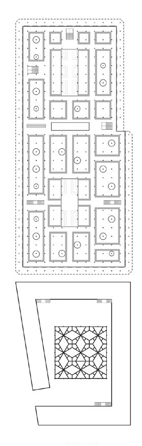 Without following the modern market to create big courtyard in the middle, the new market uses three small courtyards and numerous circular hollow area to gain daylight and provide the opportunity for interaction between two floors. In addition, the hollow areas insure the continuity of column with thinner scale to be cohesive with the roof size. The internal organization follows the traditional market form that provides table and adds small storage space in the middle of individual quadrate area to keep the proximity between the seller and the buyer in order to keep the natural feeling as the relationship built between the seller-buyer in the traditional market.