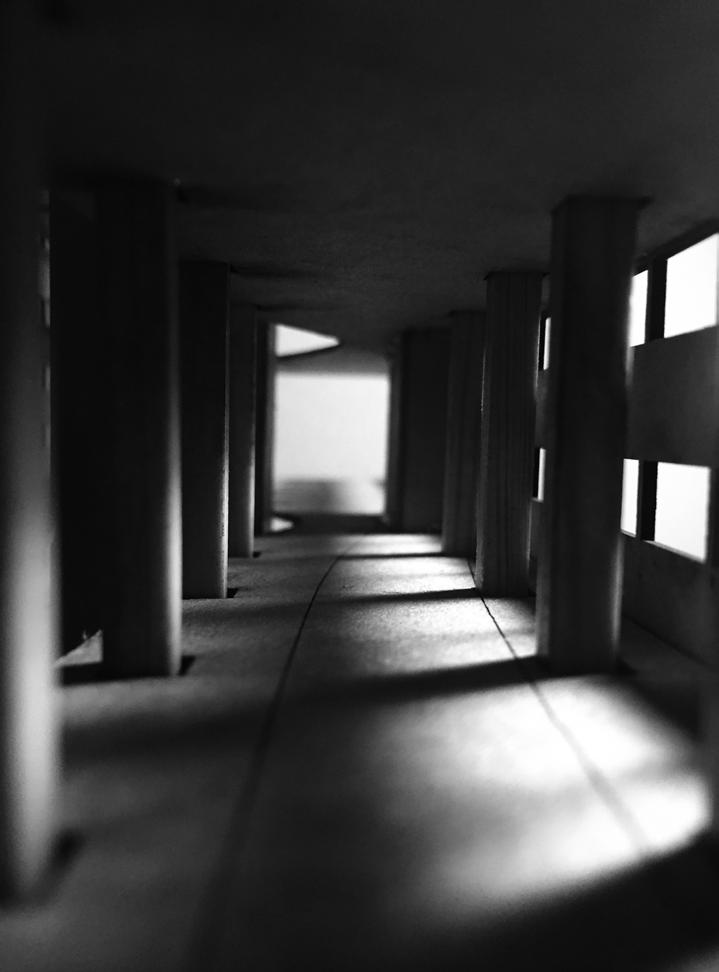 The varying window openings throughout the facade of the building creates distinct light atmospheric experiences of harshness and disfussed lighting that changes throughout the day as the sun moves on its path, creating a dynamic experience of light and shadow for its occupants.