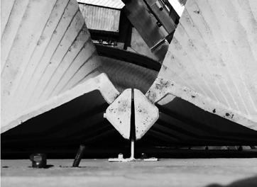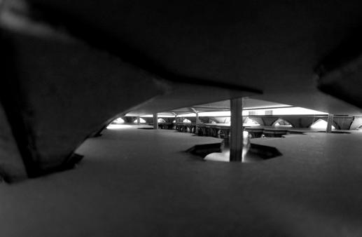 The design approach creates a large field of architectural umbrellas through layering and overlapping strategies which generate the permeable atmosphere. The permeable atmosphere is defined by four main qualities, shade, diffused lighting, natural ventilation and rain penetration. Pictures both from the model and the site will elaborate the atmospheric approach. The first picture shows the large span roof casts shades for the interior and blocks away the strong direct sunlight. The quality is also identified in the site photo as the strong contrast of light intensity between exterior and interior. The second set of pictures shows the interior shots of the market, light pass through the apertures between different layers of roofs and bouncing off the ceiling to light up the interior with a gentle and diffused lighting quality. The same lighting quality is also captured in the site photo, light passing through the skylight and reflected through ceiling, creates a comfortable interior lighting. The third set of pictures shows different sizes of openings created by layers of roofs of different height and diameters. The apertures not only allow diffused light to come in, it also allows hot air from the market to escape efficiently and cross ventilation throughout the market. Moreover, the size of the aperture and the area of the roof overlapping is calculated and controlled so that the rain will not penetrate through the gaps. The relationship between size of aperture and the scale of overlapping is shown in the detailed section drawing. The overlapping of the roof will efficiently prevent rain shooting in from 45 degree or more. In this picture of Pasar Johar, openings are created both on the roof and the wall to allow a cross ventilation inside the architecture and the size of apertures are well controlled to prevent rain penetration.