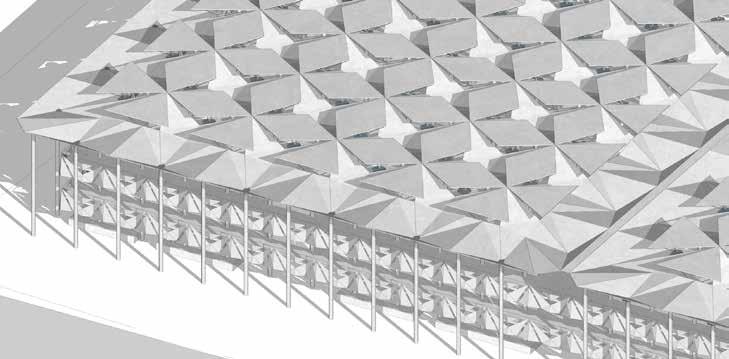 Instead of covering by a huge breathless façade, the envelop uses the similar pattern as design language which comes from the roof elevation. Transforming 2D into 3D, the folded triangles protect downstairs from rain and sunlight, and the upper part combines with handrail but also allowed light to go into market.