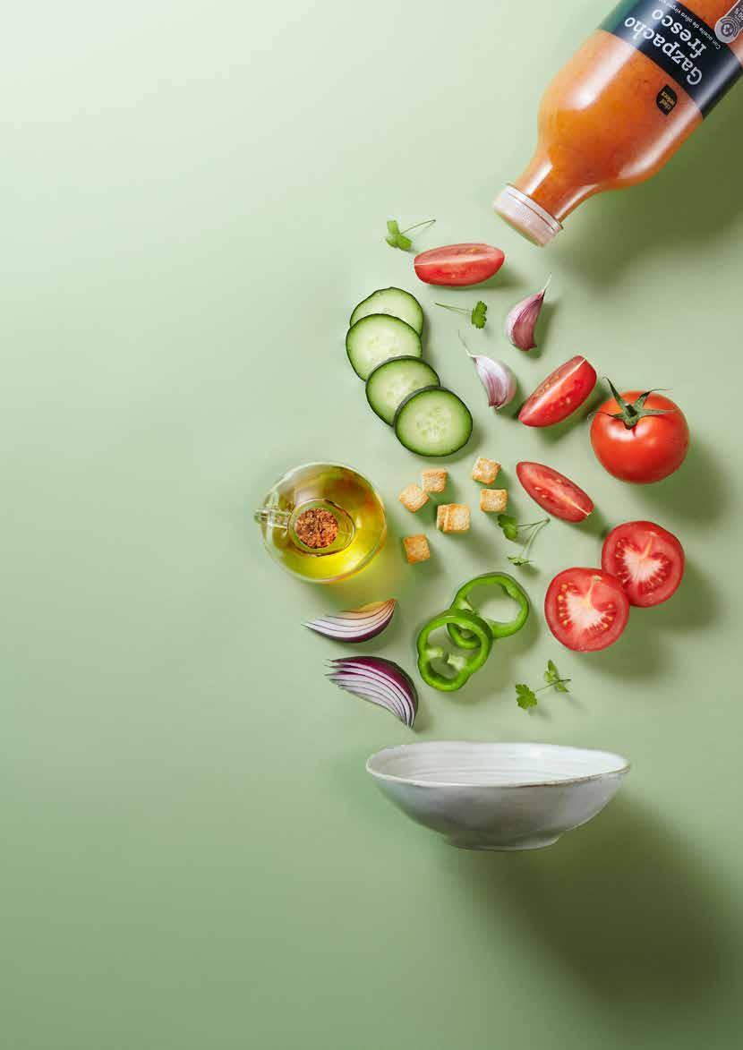 Cebolla dulce, pimiento verde y rojo, aceite de oliva virgen extra, vinagre de vino, tomate en rama, pepino y salmorejo fresco.