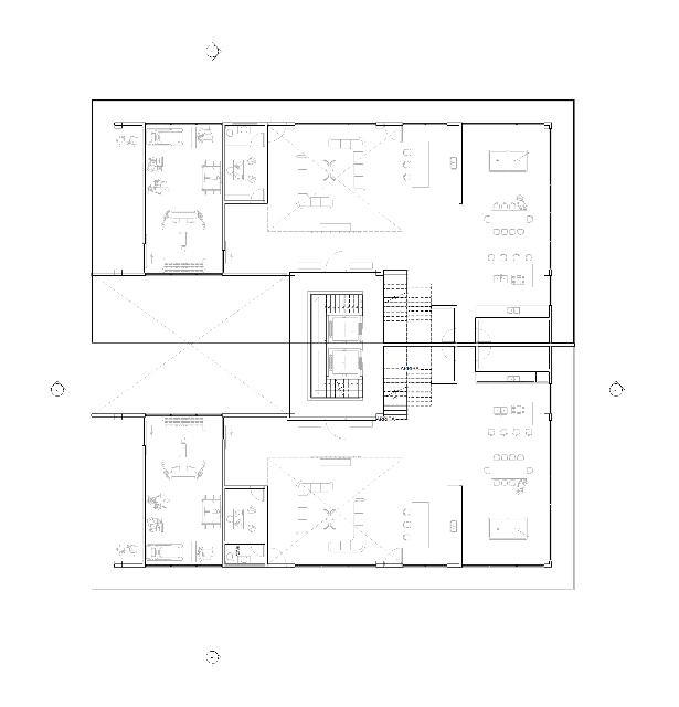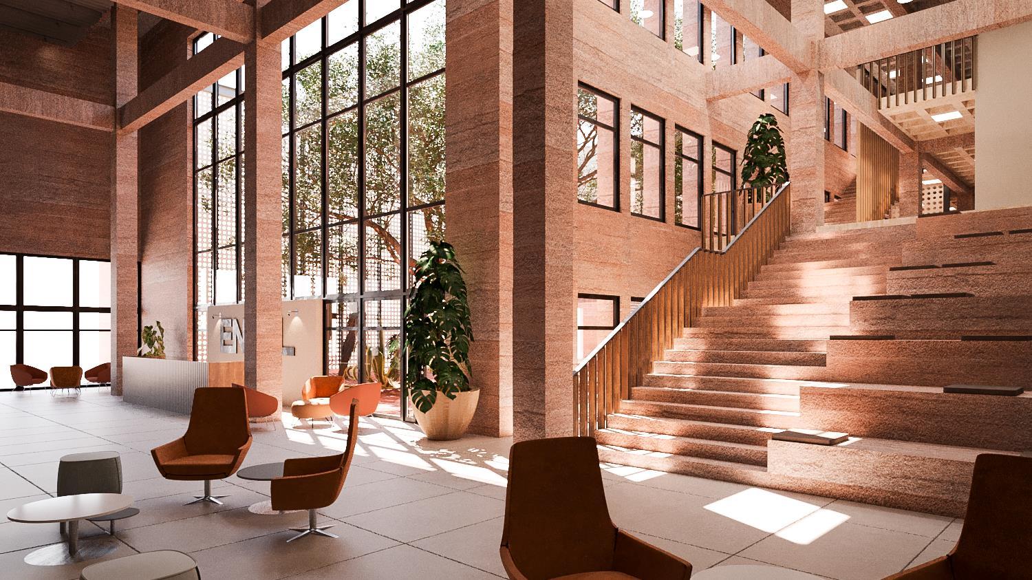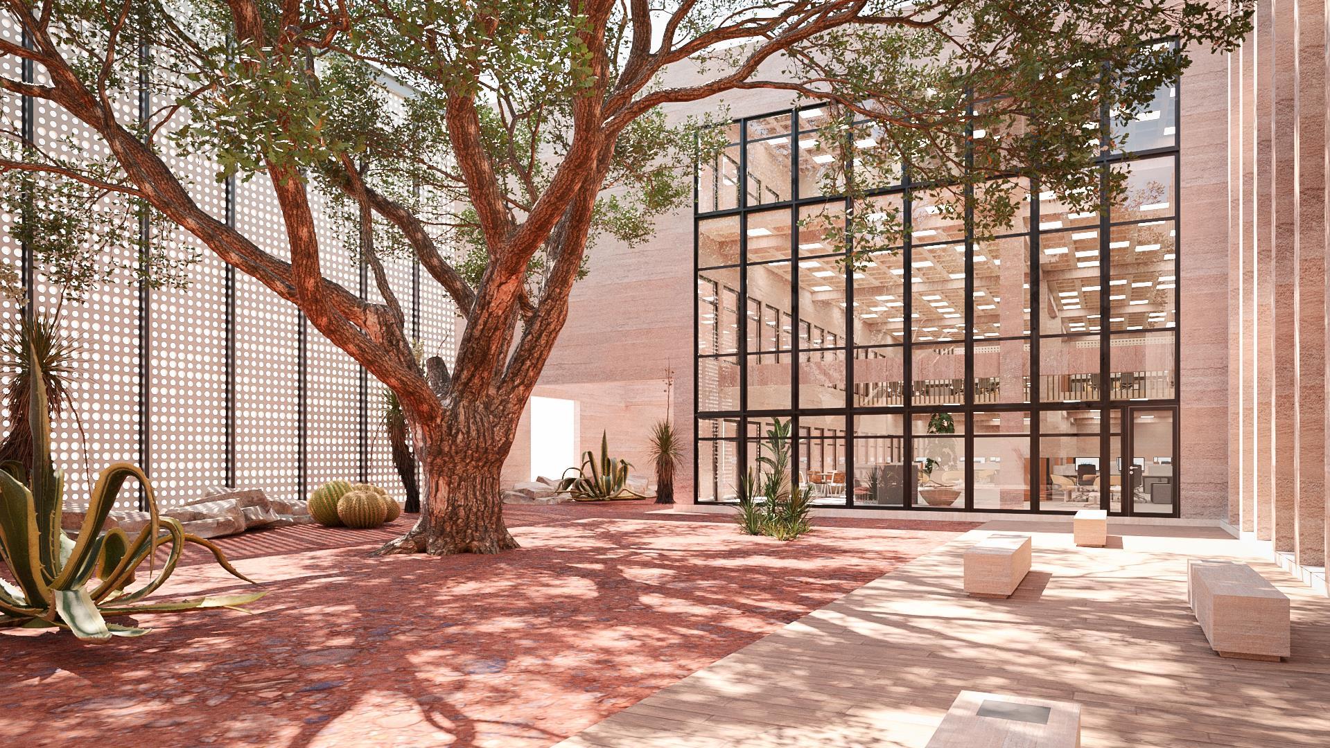 Proyecto: Es una edificación de concreto pigmentado, sólida, robusta, fuerte, que envuelve un espacio interior en que los detalles se delinean con luz y sombras La oficina vive hacia el patio interior, donde la luz se verá fragmentada por el mezquite, como un tamiz que dará ambientes cálidos a los usuarios