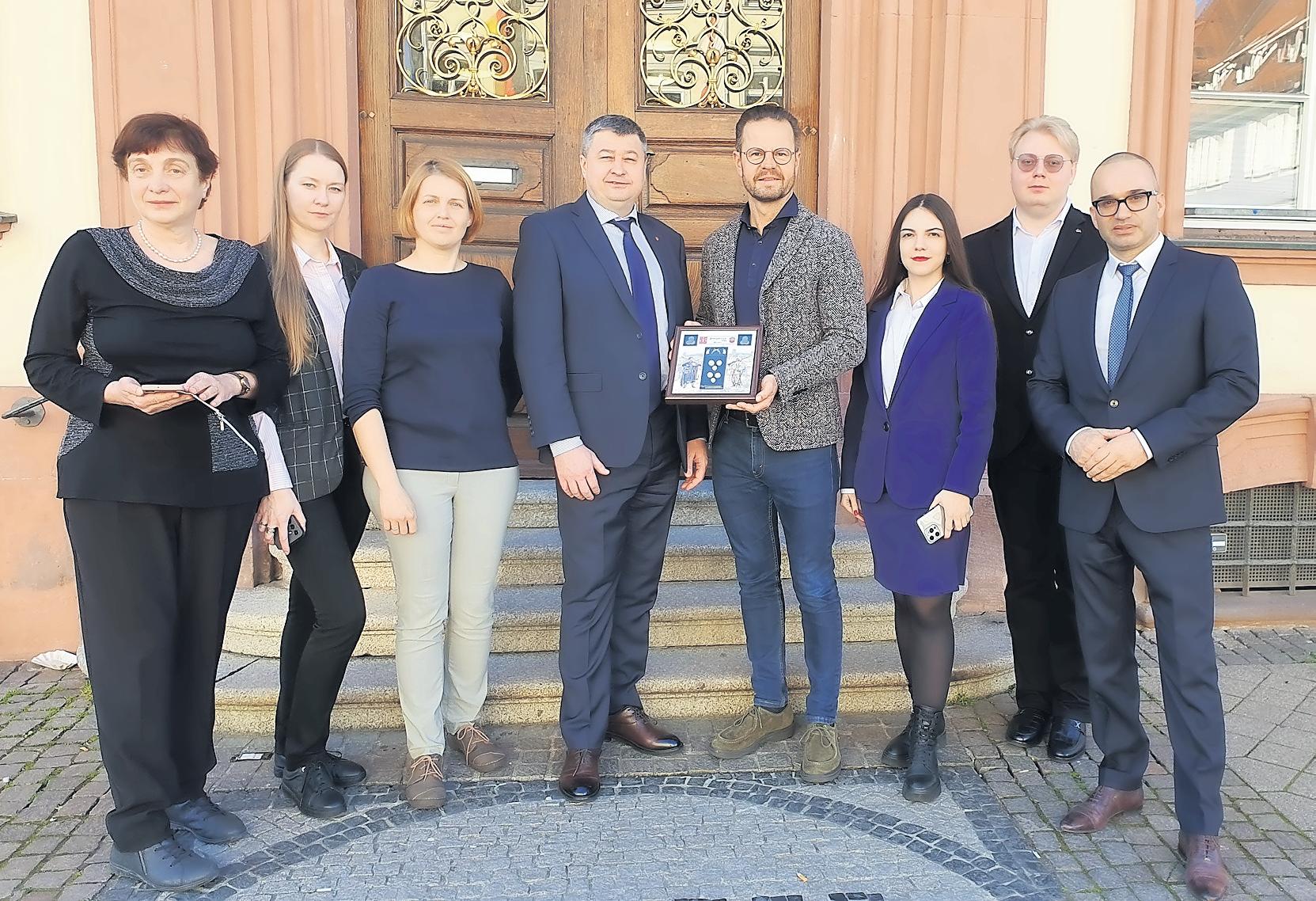 Eine ukrainische Delegation der National University Zaparizhzhia Polytechnic konnte Oberbürgermeister Marco Steffens (4.v.r.) am Dienstag im Historischen Rathaus begrüßen. Die Besucher*innen verbrachten einige Tage in der Kinzigstadt und informierten sich u.a. über neueste Entwicklungen an der Hochschule Offenburg. OB Steffens sieht in dieser Partnerschaft „einen Beweis für die akademische Zusammenarbeit und Solidarität in herausfordernden Zeiten.“ Steffens zeigte sich davon überzeugt, dass das einvernehmliche Miteinander und der anregende Austausch weiter wachsen und den Studierenden sowie Forschenden neue Möglichkeiten aufzeigen werde: „Dieser Besuch ist ein wichtiger Schritt.“ Foto: Kathrin Benz