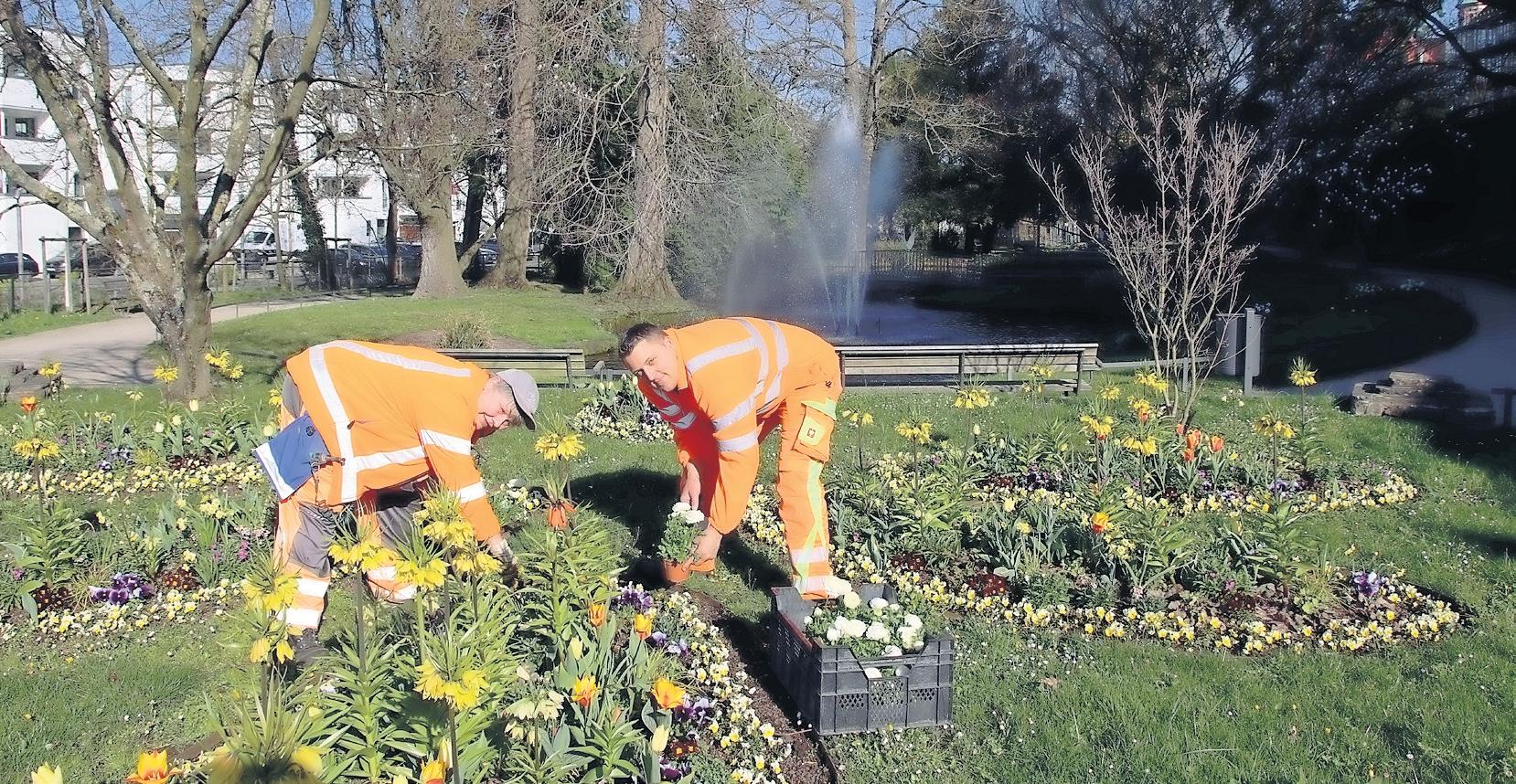 Wechselflorbeete müssen aufgelockert und abgestorbene Stauden und Gräser entlang den Straßenzügen, Kreisverkehren, Baumscheiben, Verkehrsinseln oder Parkanlagen für den Neuaustrieb zurückgeschnitten werden. Ausschwemmungen durch Starkregenfälle und Schlaglöcher werden verfüllt und erhalten einen neuen Belag. „Die letzten Blühwiesenaussaaten wurden bereits