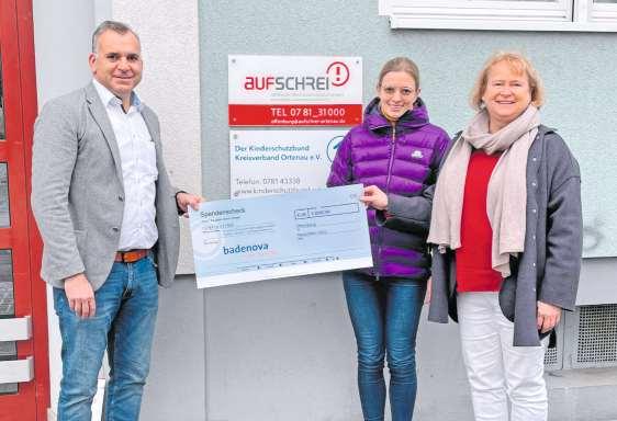 Geldsegen. Thomas Maurer (Regionalmanager Badenova) überreichte Sonja Emming und Marita Osterheider-Panzer vom Verein „Aufschrei“ einen Scheck in Höhe von 5000 Euro. Der Energie- und Umweltdienstleister hat in der Region insgesamt 175000 Euro an karikative, soziale und kulturelle Einrichtungen und Organisationen gespendet, die besonders von Corona betroffen waren oder sind. „Aufschrei“ will trotz der Krise den Opfern sexueller Gewalt verlässliche Unterstützung bieten. Dies geschieht durch Beratung, Fortbildungen für Fachkräfte und Institutionen sowie Präventionsangebote für Kinder und Jugendliche. 2022 liegt der Fokus besonders auf der Neugestaltung vorhandener Präventionskonzepte und auf der Präventionsausstellung „Echt Klasse!“. Die erste Vorsitzende Osterheider-Panzer versicherte: „Wir sind sehr froh, in dieser Krise wahrgenommen und finanziell unterstützt zu werden. Sehr herzlich bedanken wir uns bei der Badenova für diese Spende, mit der wir unsere Projekte für 2022 gestalten können. Kontaktdaten von Aufschrei: Telefon 0781/31000 von Montag bis Freitag, 8.30 bis 12.30 Uhr. E-Mail: offenburg@aufschrei-ortenau.de. Foto: Badenova