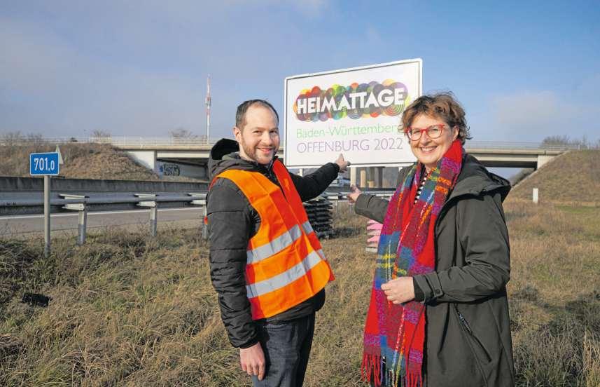 Hinweis auf Heimattage. Unübersehbar sind die Schilder, die seit der vorigen Woche zu beiden Seiten der Autobahn A5 von den Heimattagen 2022 in Offenburg künden. Kulturchefin Carmen Lötsch (r.) und Projektverantwortlicher Manuel Brenneisen zeigten sich mit der optischen Wirkung zufrieden. „Einfach so“ können die Tafeln übrigens nicht aufgestellt werden. Die ausrichtenden Städte erhalten im jeweiligen Heimattagejahr eine Sondergenehmigung für die Aufstellung der zwei mal drei Meter großen Schilder. Foto: Bode