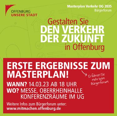 Mobilität und Verkehr. Beim Bürgerforum am Dienstag, 14. März , ab 18 Uhr (Einlass ab 17.30 Uhr) in den Konferenzräumen im Untergeschoss der Messe Offenburg werden erste Ergebnisse vorgestellt. Wie könnten Mobilität und Verkehr in Offenburg zukünftig aussehen? Welche Maßnahmen müssen zum Erreichen der beschlossenen Ziele kombiniert werden? Nach einem Überblick zum Projektstand können Teilnehmende Fachleuten aus Verwaltung und Planungsbüros Fragen stellen. Anschließend laden Infostände ein, Diskussionen zu den einzelnen Szenarien weiter zu vertiefen. Aktuelle Infos zum Projekt Masterplan Verkehr OG 2035 gibt es unter mitmachen.offenburg.de. Foto: Grafikteam Werbeagentur GmbH