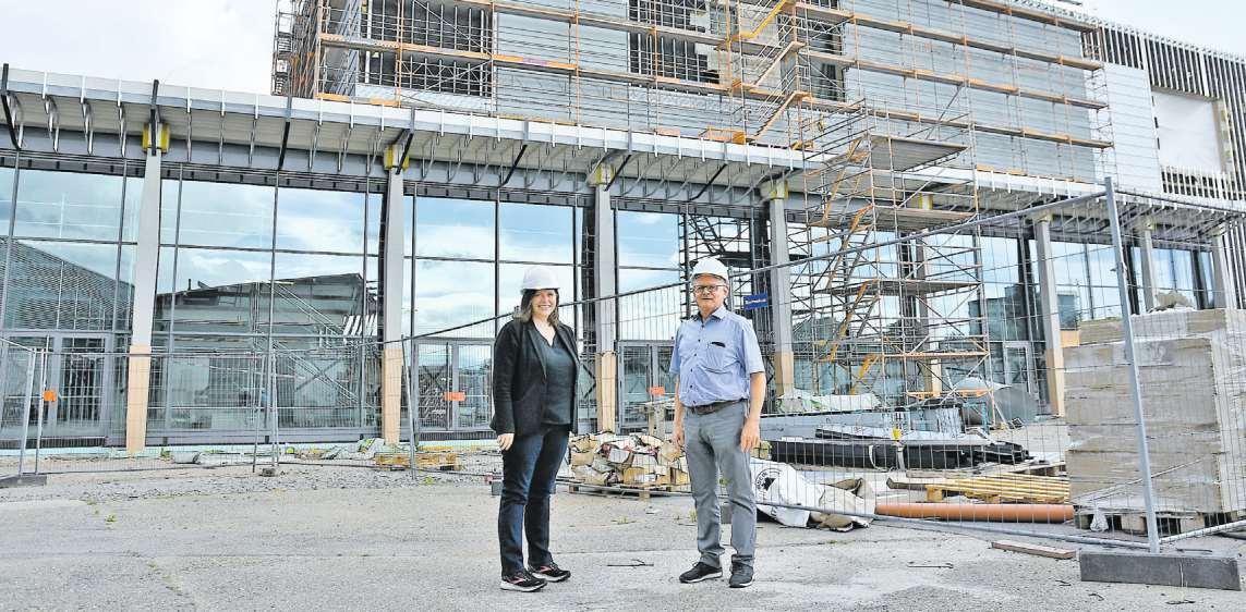 Vorfreude. Messe-Chefin Sandra Kircher (l.), technischer Leiter Martin Roth vor der künftigen EDEKA-Arena Foto: Lötsch