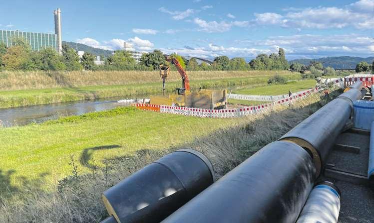 timeter über die Flussbettsole hinaus und erstreckt sich vom Ufer auf der Seite vom Messegelände ausgehend bis zur Hälfte des Flussbetts Das Wasser in der Kinzig wird über die noch offene Flussseite umgeleitet Zum Hochwasserschutz ist der Geoponton durch Big-Bags gesichert, wobei eine Überströmung durchaus möglich ist In der durch den Geoponton gebildeten Baugrube erfolgt die Verlegung der Fernwärmerohre der Wärmeversorgung Offenburg Zeitgleich wird der gemeinsame Rohrgraben vom Überlandwerk Mittelbaden genutzt, um zusätzlich Leerrohre für spätere Mittelspannungsleitungen zu verlegen Als drittes Unternehmen verlegt badenovaNETZE Wasserleitungen zur Verbindung von zwei Wassernetzen