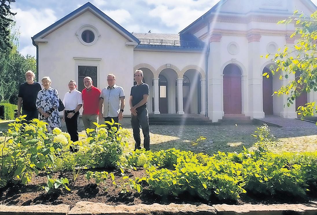 Zwei symmetrisch angelegt Schmuckbeete bilden neuerdings das Entrée zur Kapelle auf dem Waldbachfriedhof. Die Initiative ging vom Förderkreis Historischer Waldbachfriedhof um die Vorsitzende Cornelia Kalt-Jopen (2.v.l) und ihren Stellvertreter Heinrich Meyer (4.v.l.) aus. Sie dankten den Technischen Betrieben (TBO) und der Friedhofsverwaltung, vertreten durch die Chefs Alex Müller (3.v.l.) und Hans-Jürgen Jäger (5.v.l.) für die Unterstützung. Um die Pflege werden sich ehrenamtlich Hans-Martin Einstein (l.) und Thomas Bauknecht (r.) kümmern. Die Beete mit einer Vielzahl von Stauden entsprechen der historischen Anlage aus der Zeit um 1900. Die Sandstein-Einfassung stammt von dem kürzlich abgebrochenen Wärterhaus. Die Bewässerung wird künftig unterirdisch über Schläuche erfolgen – die Anschlüsse sind bereits vorhanden.