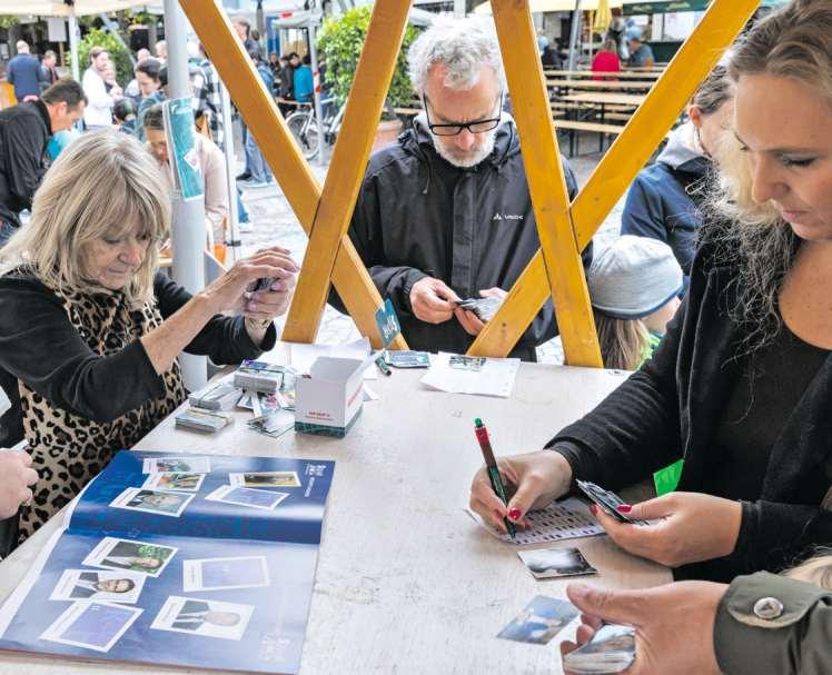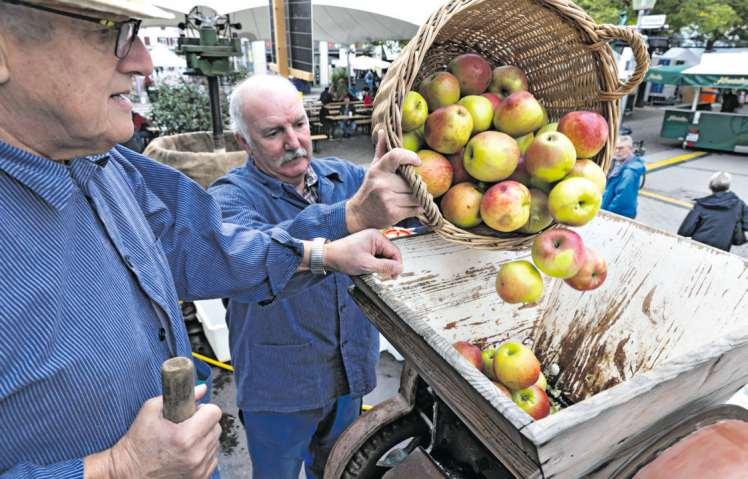 Gut besucht. Nicht nur auf dem Marktplatz drängten sich die Besucher*innen. Bauernmarkt. Von Karl Schmider (li.) und Rolf Fröhlich gab‘s frischen Apfelsaft.