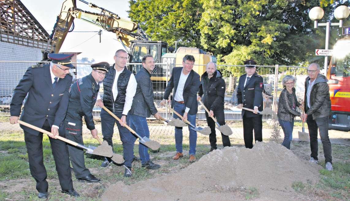 Spatenstich. Feuerwehrkommandant Peter Schwinn, Kreisbrandmeister Bernhard Frei, Markus Huber (Rendler Bau GmbH), Fachbereichsleiter Hochbau, Grünflächen und Umweltschutz Andreas Kollefrath, Baubürgermeister Oliver Martini, Weiers Ortsvorsteher Stefan Sauer-Bahr, Abteilungskommandant Jürgen Lindenmeier, Schaeffersheims Bürgermeisterin Marie-Berthe Kern und Waltersweiers Ortsvorsteher Konrad Gaß (von links). Foto: Gabriel