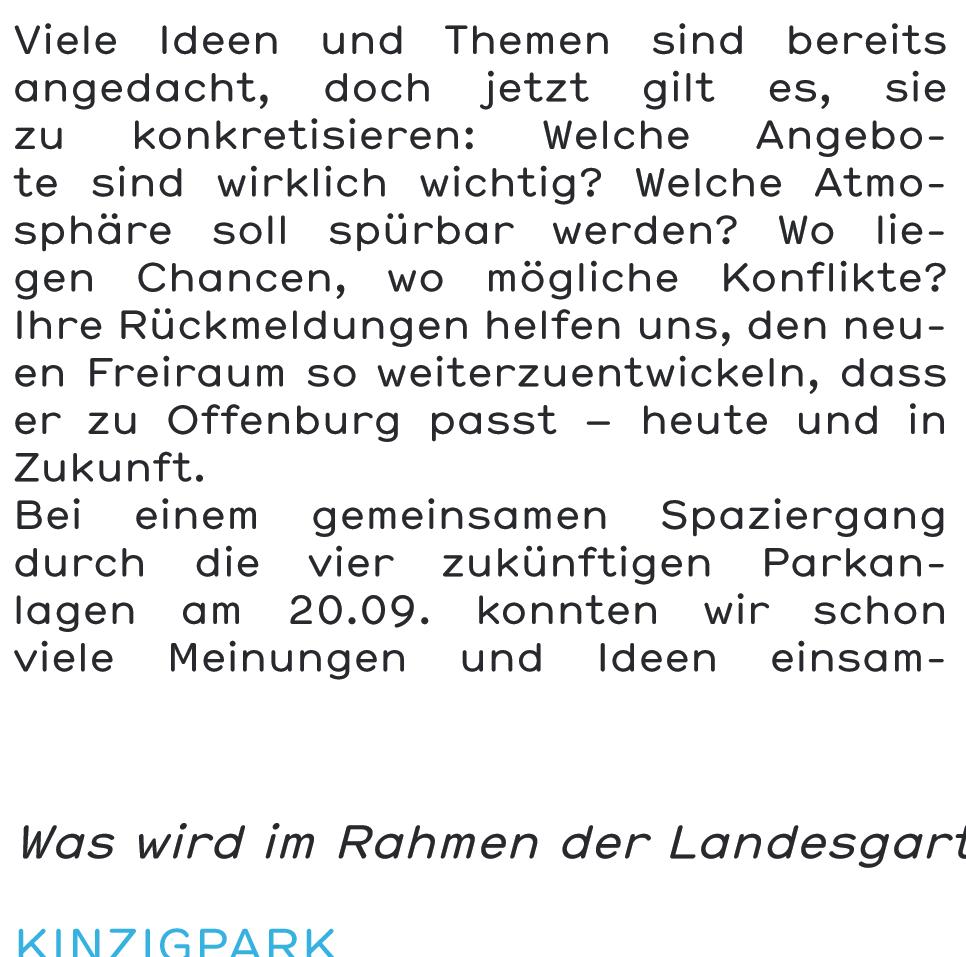 Aufenthaltsorten, naturnahen Angeboten und neuen Wegeverbindungen stärker mit der Kinzig zu verknüpfen und gleichzeitig wichtige Impulse für Stadtentwicklung, Klimaschutz und Lebensqualität zu setzen. Mit der aktuellen Beteiligungskampagne „Was kommt, was bleibt?“ wollen wir gemeinsam mit Ihnen die nächsten Schritte gestalten. Es geht dabei vor allem darum, was als dauerhafte Qualität für Offenburg bleibt.