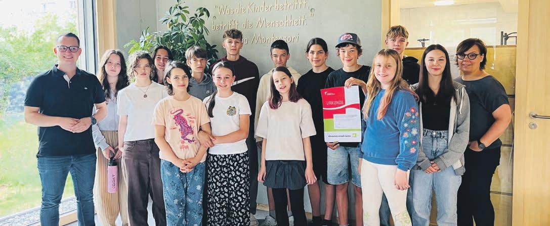 Roman Wunsch von der Stadt Offenburg bei der Urkundenübergabe zusammen mit Schulleiterin Christina Beilharz der Gemeinschaftsschule des Montessori-Zentrum Ortenau und engagierten Schüler*innen.