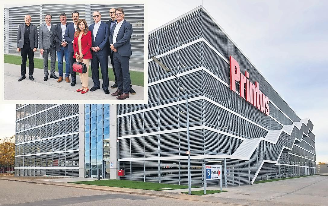 Gebäude mit Strom versorgen wird. „Wir sind uns unserer Verantwortung bewusst. Deshalb wollten wir mit diesem Parkhaus nicht nur die Parksituation für die Mitarbeitenden verbessern, sondern gleichzeitig unseren Beitrag für eine umweltbewusste Zukunft leisten“, so Geschäftsführer Peter Kirchberg. Das macht sich auch im Innenbereich bemerkbar: Eine intelligente Steuerung schaltet das Licht nur dort ein, wo Bedarf besteht und die Helligkeit durch Tageslicht nicht ausreicht. Mit Ladepunkten für E-Autos und E-Bikes entspricht das Haus den Anforderungen einer zeitgemäßen Mobilität. Für OB Marco Steffens steht das Parkhaus „für Innovation, Nachhaltigkeit und den zukunftsorientierten Unternehmergeist, den Printus seit Jahrzehnten verkörpert“. Die Investition in