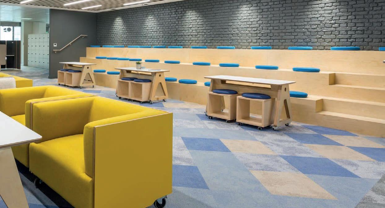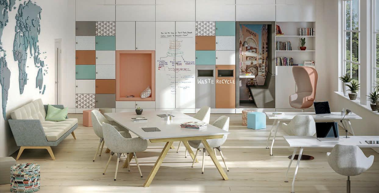 Promote creativity with a feature wall that matches your brand’s colour palette. Include considerations that also represent your brand’s purpose. If you’re all about building connections, instil a sense of community with multi-team break hubs.