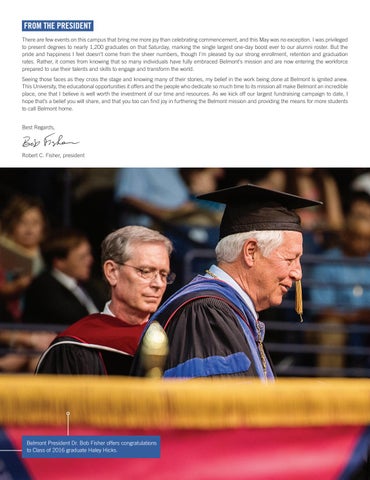 FROM THE PRESIDENT There are few events on this campus that bring me more joy than celebrating commencement, and this May was no exception. I was privileged to present degrees to nearly 1,200 graduates on that Saturday, marking the single largest one-day boost ever to our alumni roster. But the pride and happiness I feel doesn’t come from the sheer numbers, though I’m pleased by our strong enrollment, retention and graduation rates. Rather, it comes from knowing that so many individuals have fully embraced Belmont’s mission and are now entering the workforce prepared to use their talents and skills to engage and transform the world. Seeing those faces as they cross the stage and knowing many of their stories, my belief in the work being done at Belmont is ignited anew. This University, the educational opportunities it offers and the people who dedicate so much time to its mission all make Belmont an incredible place, one that I believe is well worth the investment of our time and resources. As we kick off our largest fundraising campaign to date, I hope that’s a belief you will share, and that you too can find joy in furthering the Belmont mission and providing the means for more students to call Belmont home. Best Regards,