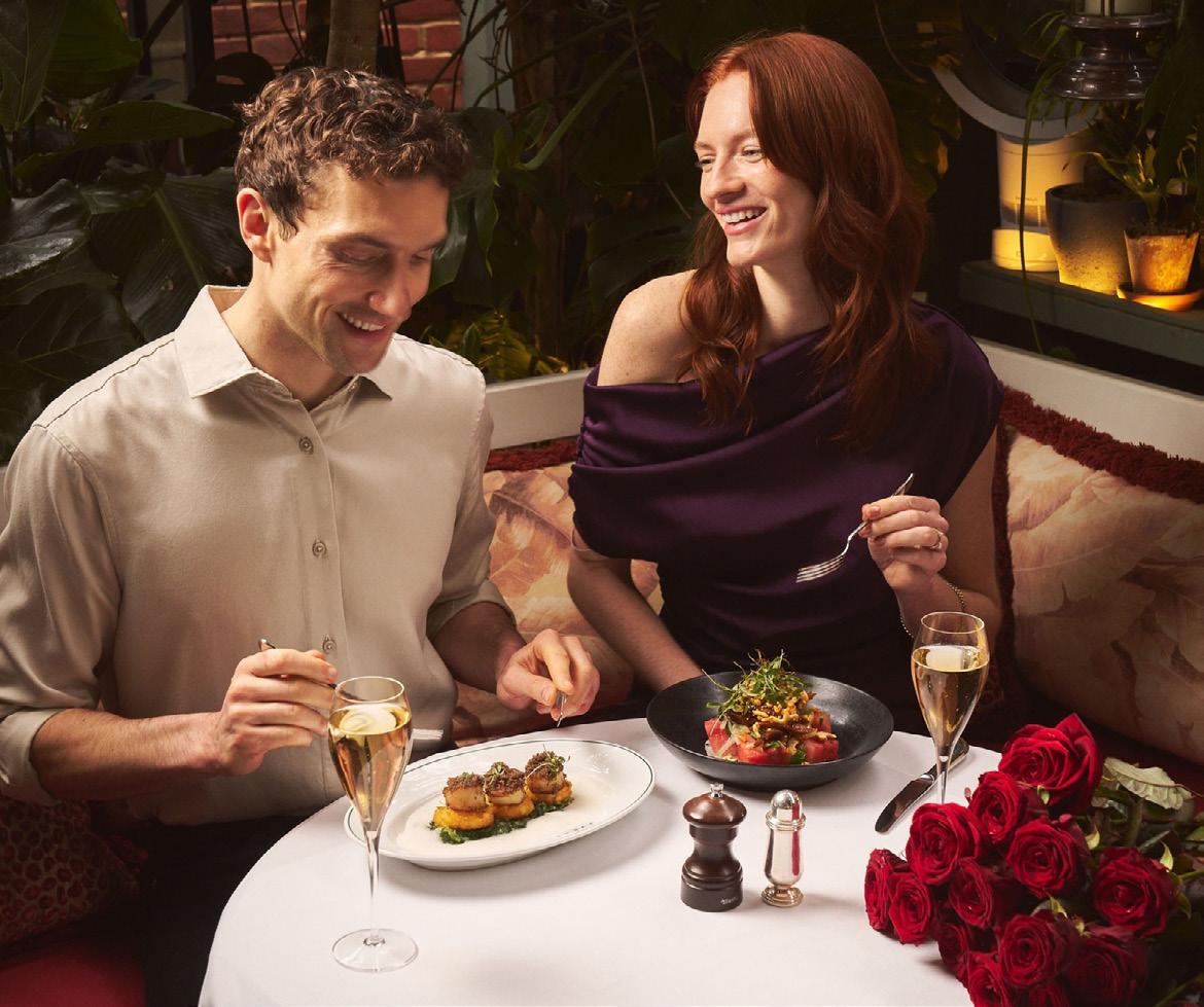 Amid lush interiors and garden-inspired elegance, begin your celebrations with a glass of perfectly chilled champagne before savouring seared scallops and blackened cod with a delicate miso glaze. Finish on a sweet note with a rose petal parfait, an elegant dessert that is as beautiful as it is indulgent and sure to impress your plus one.