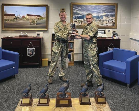 Lt Col Soane Dep Comd ES, HQ 1(UK) Division (right) presenting the winner’s trophy to Maj Dalrymple, 2IC 2 Bn REME